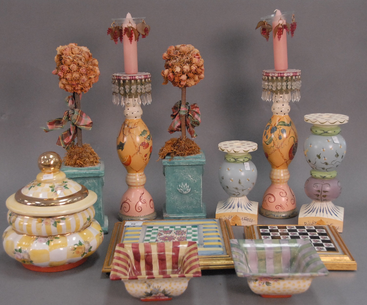 Eleven piece lot to include pair of Tracy Porter candlesticks, pair of Gracey Knight candlesticks, pair of dried flower urns, two Mackenzie Child’s tiles, Mackenzie Child’s covered jar, and two Mackenzie Child’s bowls.