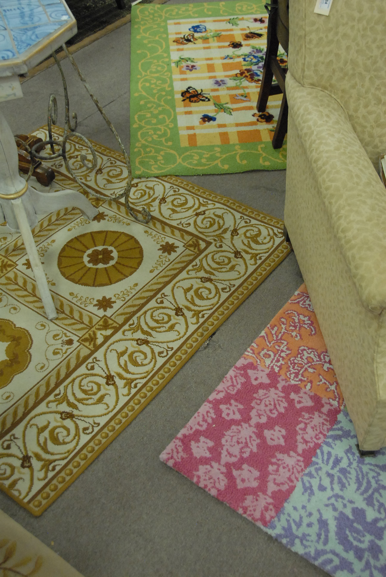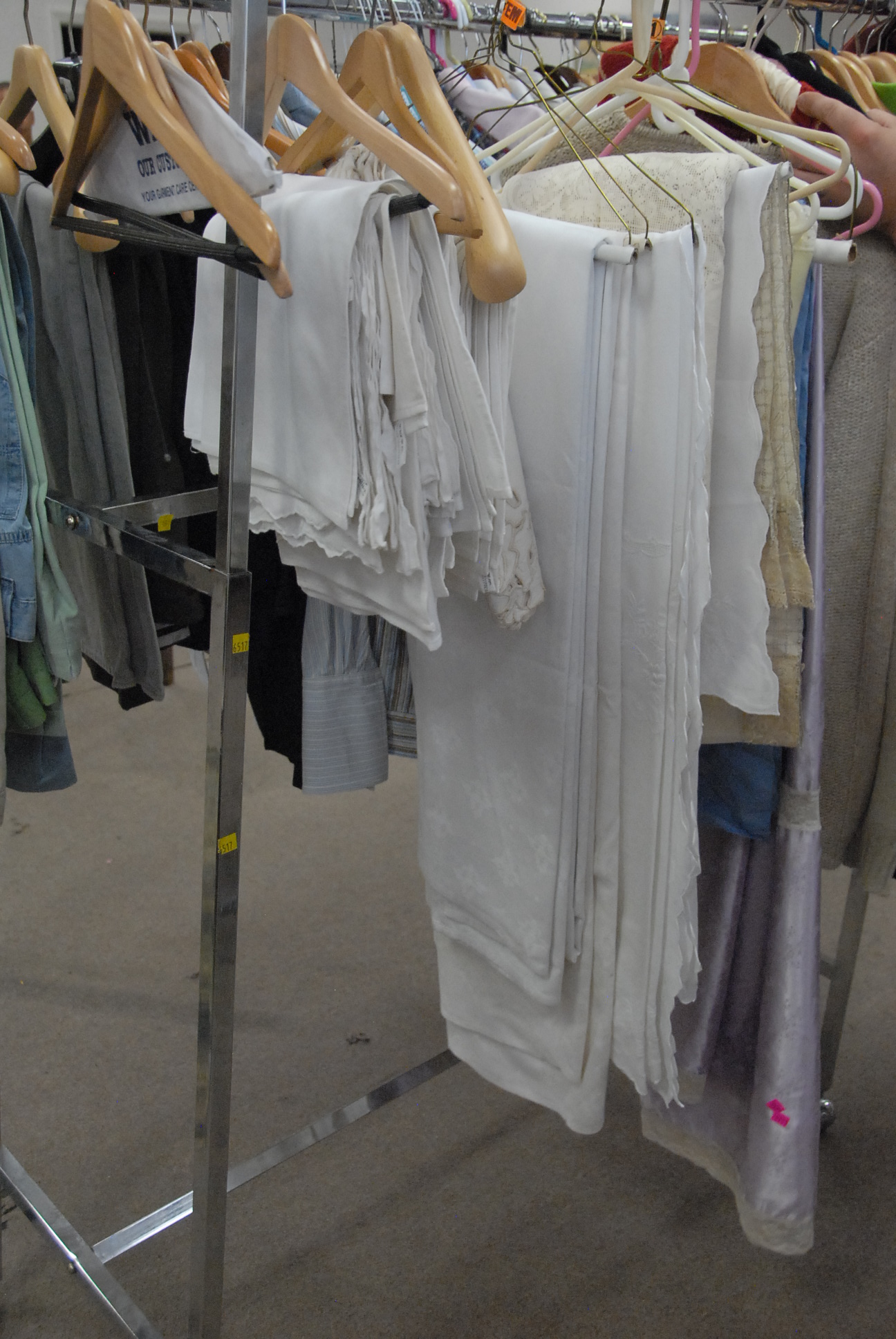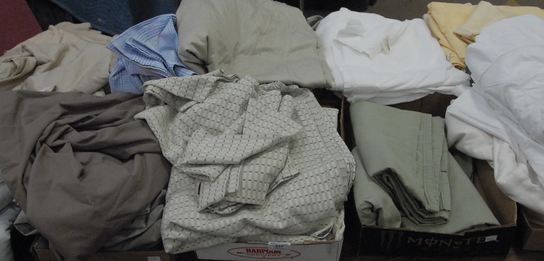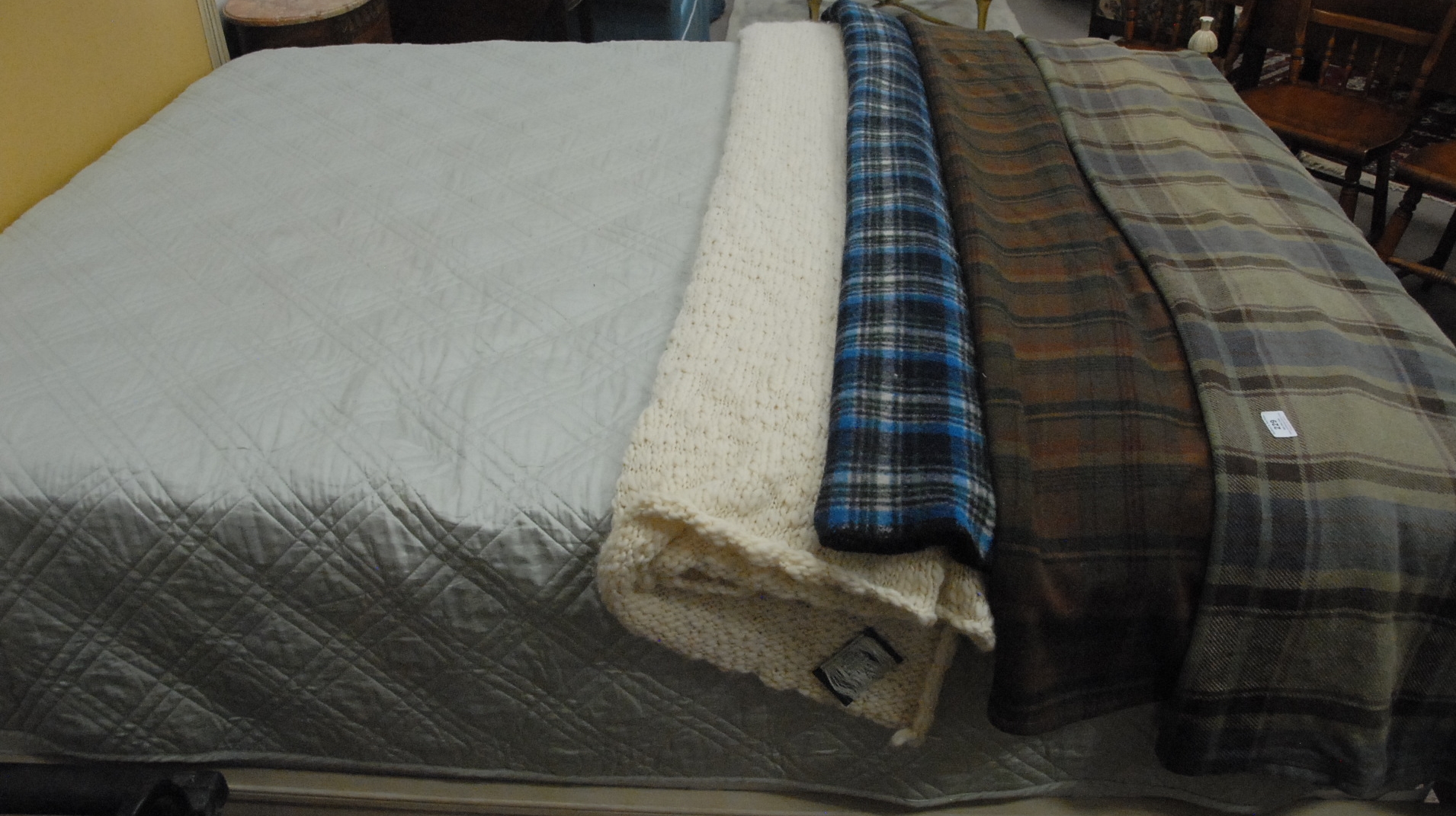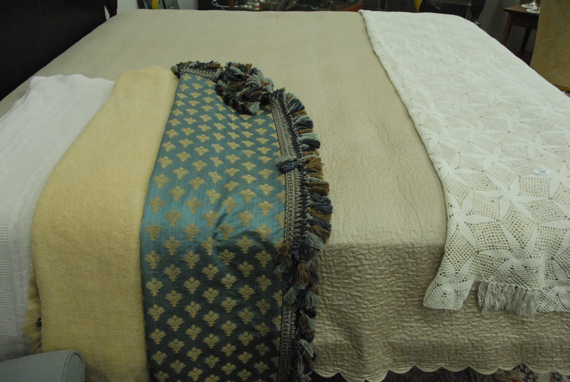 Group of five blankets to include Glen Cree mohair throw cover, Faribo throw cover, silk throw cover with fringes, king size Home Treasures comforter, and another bed cover.