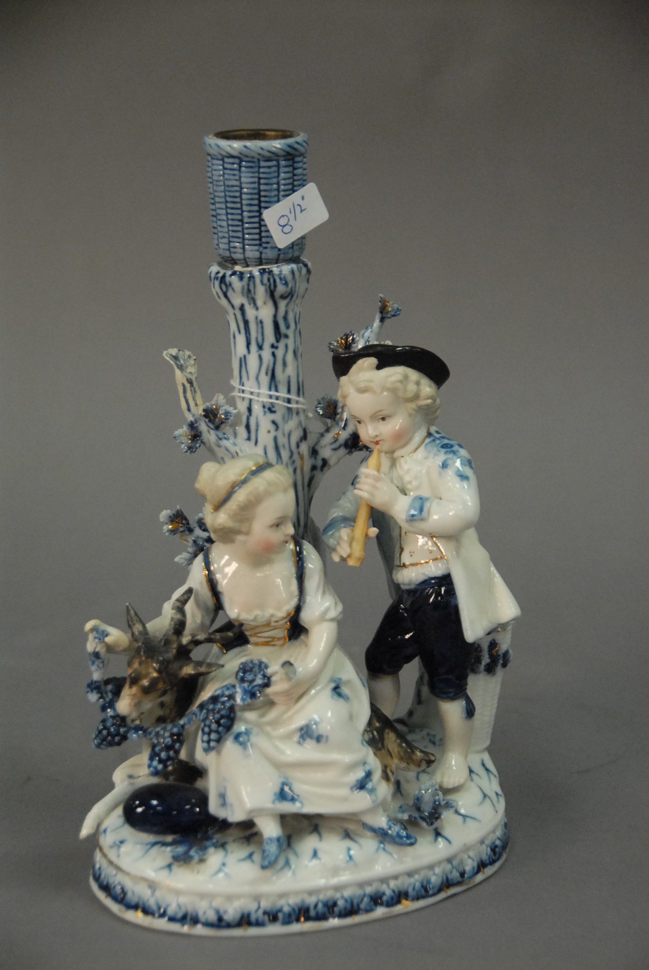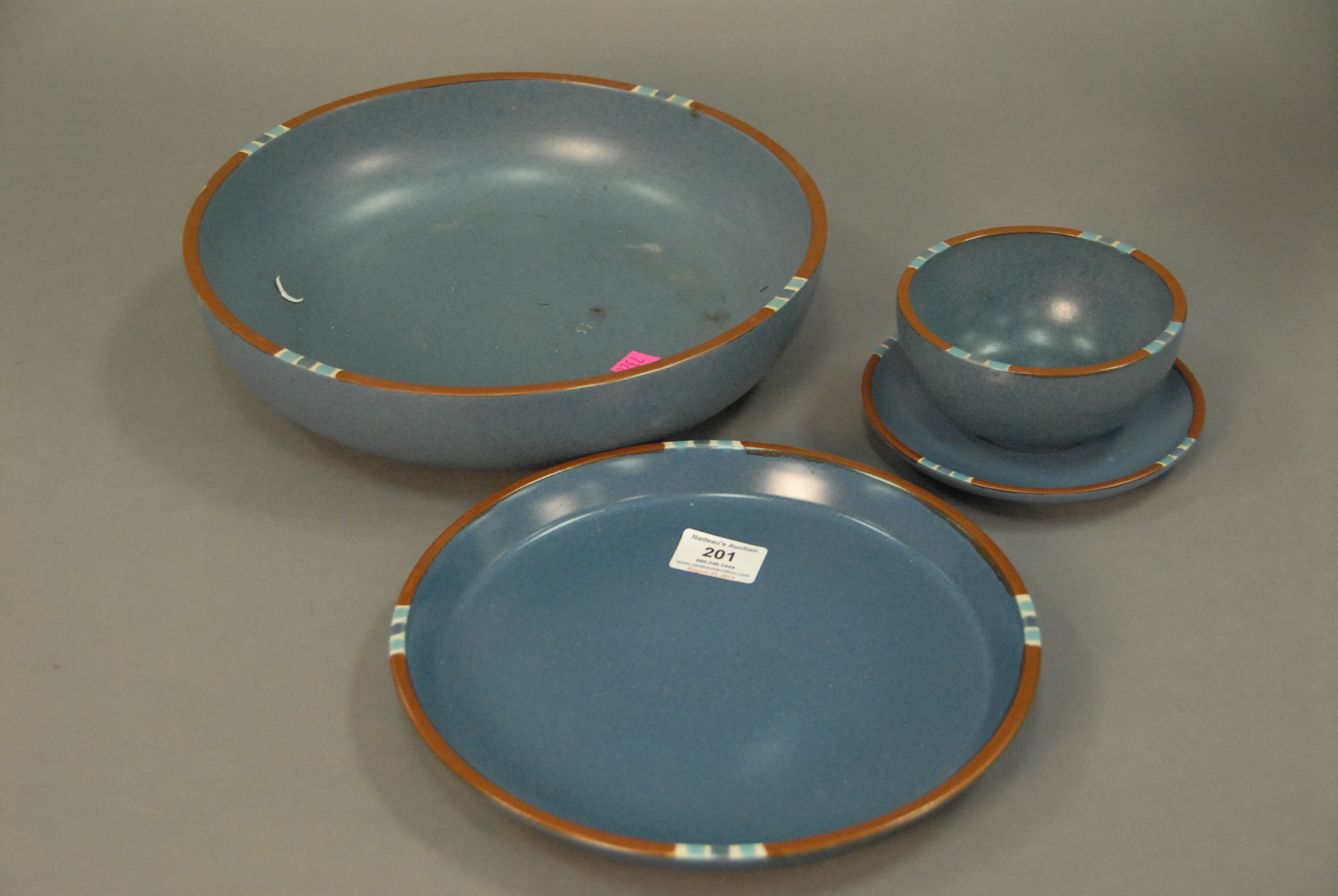 Group lot to include Dansk blue partial 20 piece dinner set with large serving pieces, Dansk candle holders, three Le Creuset pieces, two enameled strainers, Fiestaware pot, and two Corning pieces.