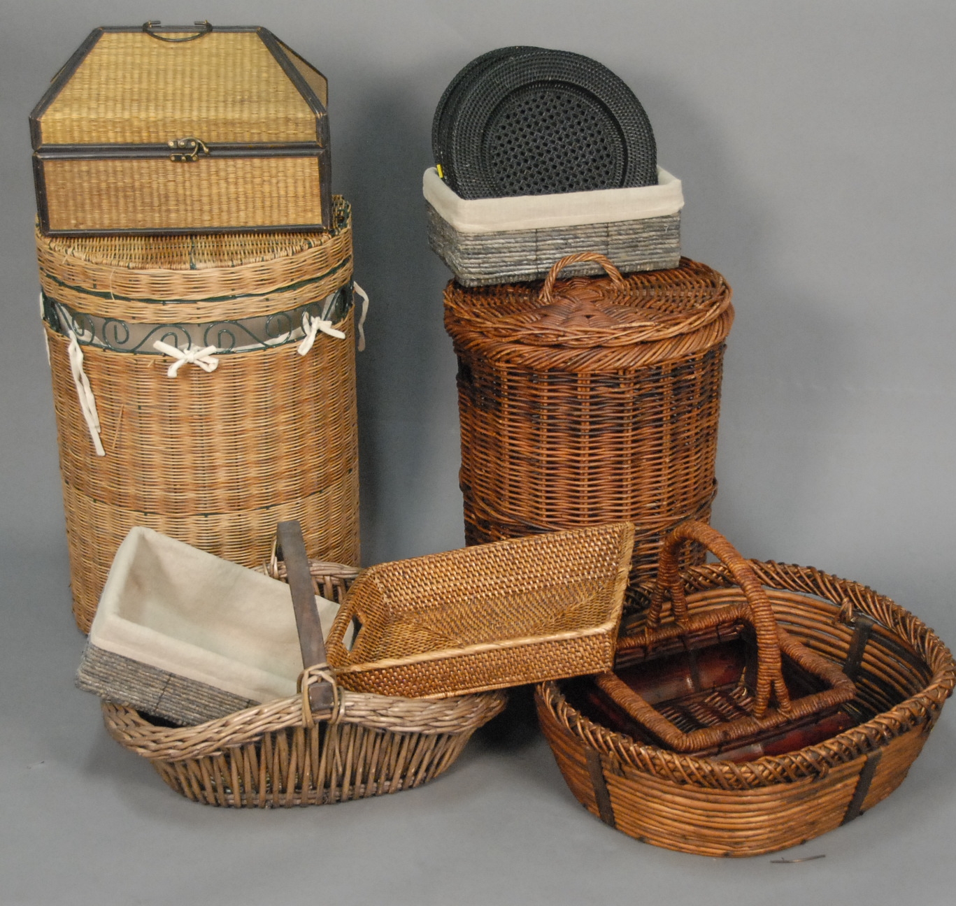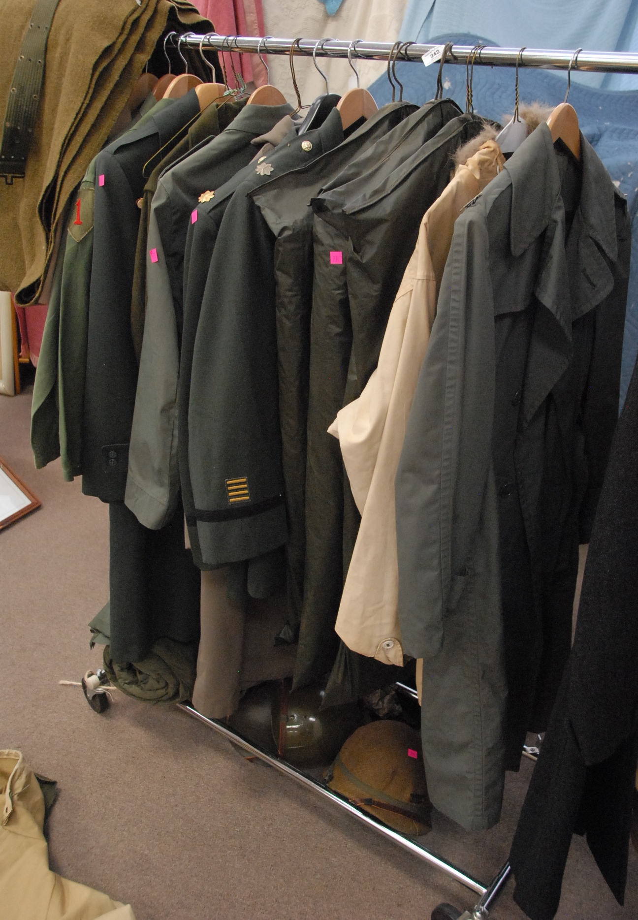 Group of military items to include suits, coats, blankets, helmets, and bags.