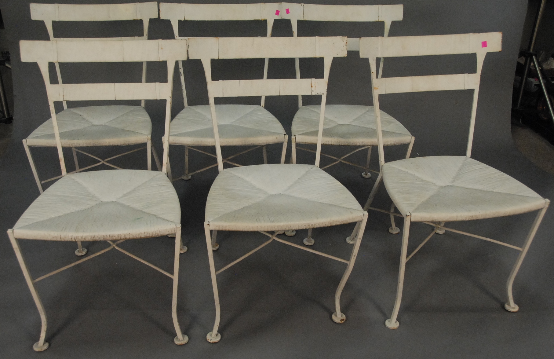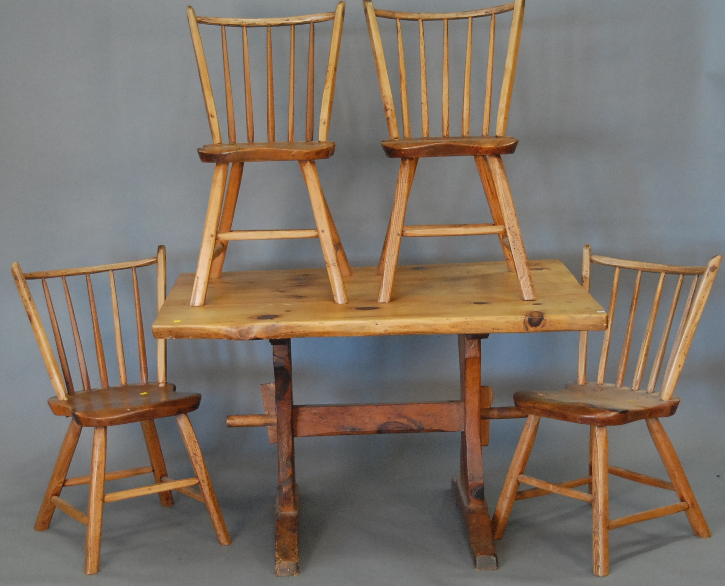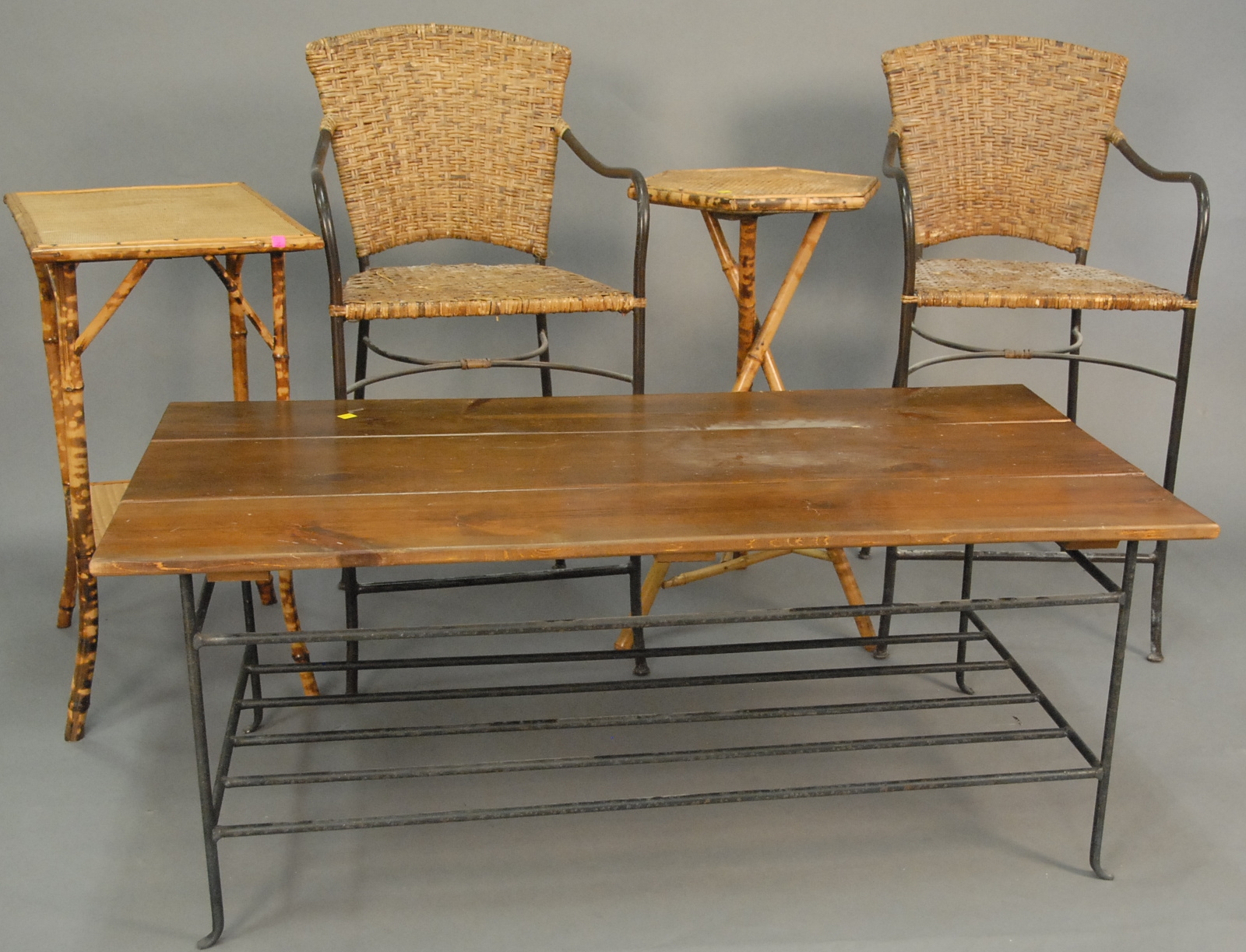 Seven piece lot including Hunt bench along with five chairs and a table attributed to Hunt.