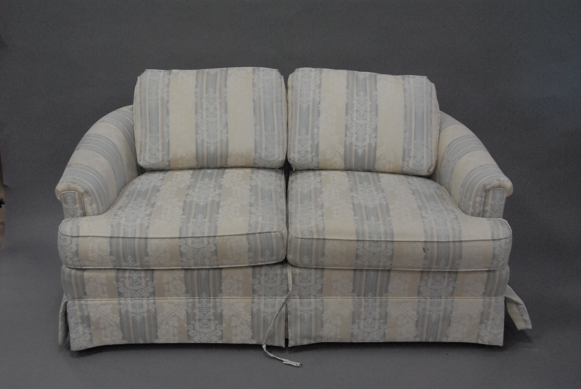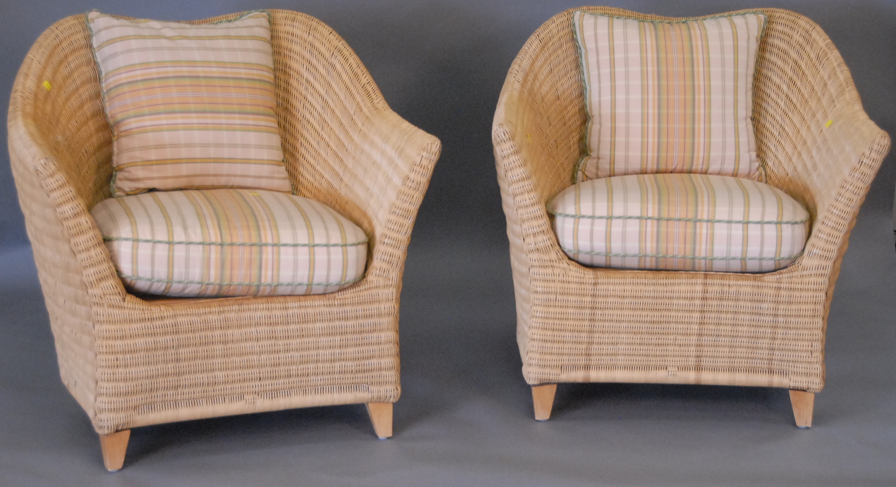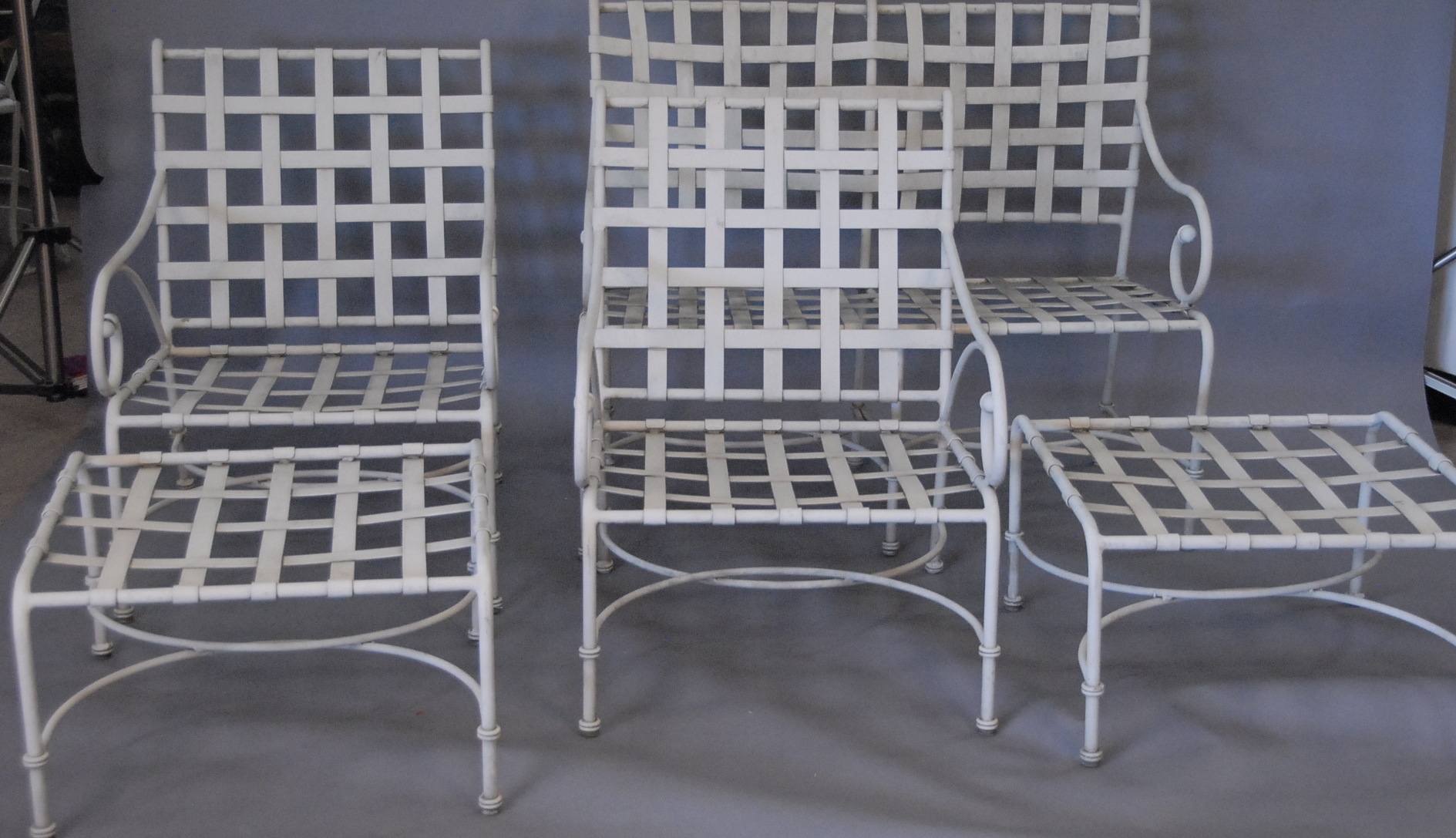 Brown Jordan five piece set including loveseat, two armchairs, and two footstools.