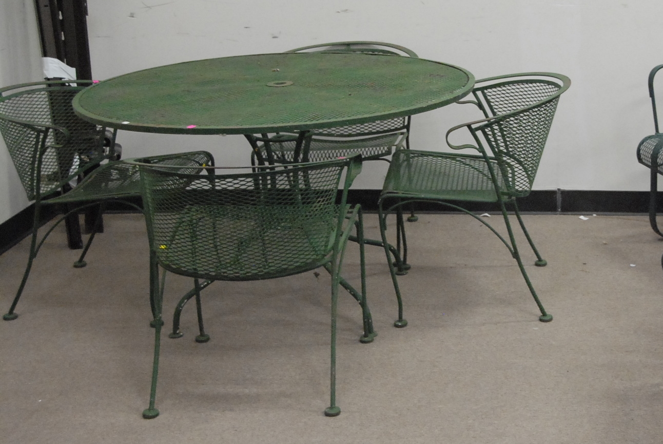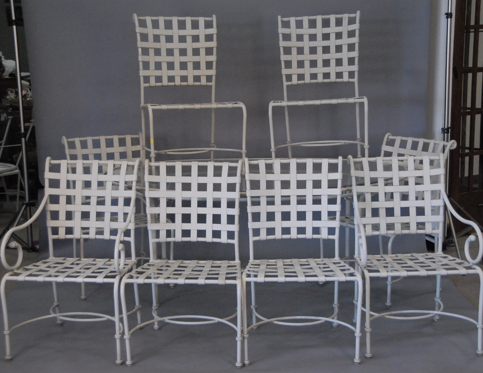 Brown Jordan 11 piece set to include oval glass top table and 7 side chairs, 2 armchairs, and an umbrella.