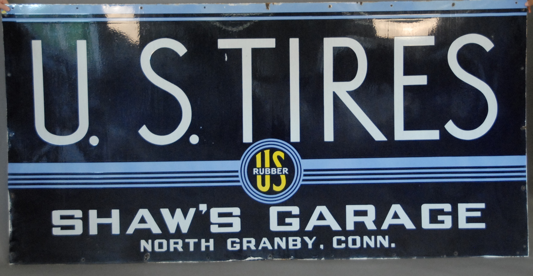 Enameled sign, U.S. Tires Shaw’s Garage North Granby, CT. 4′ x 8′.