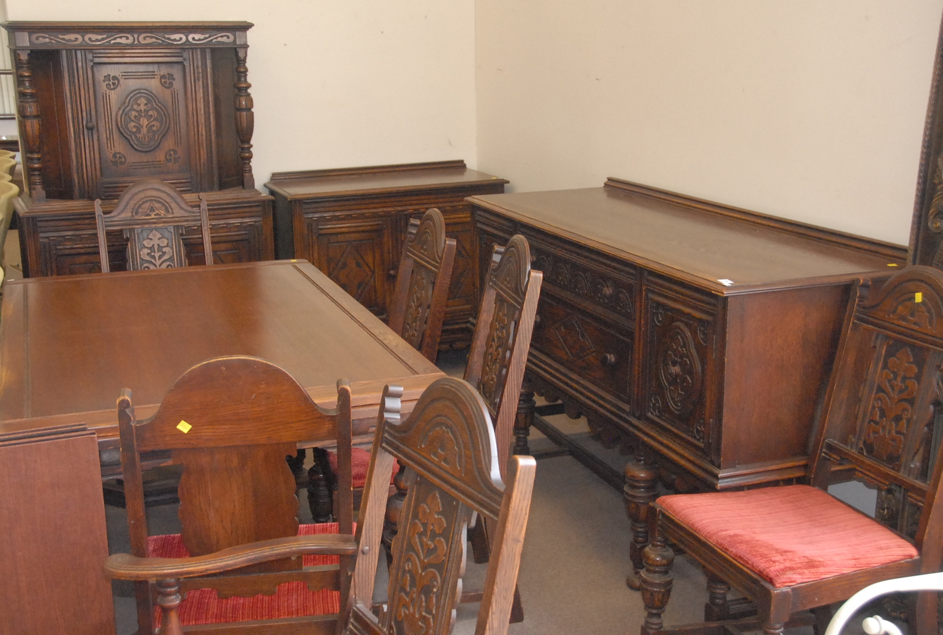 Ten piece oak dining room set, ht. 31 1/2 in. lg. 62 in. wd. 38 in.