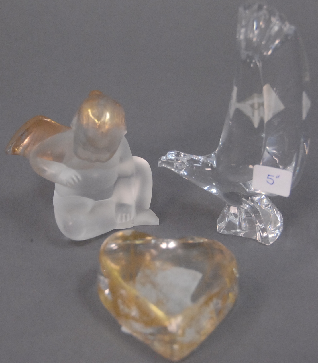 Three small crystal pieces to include Lalique angel, Sevres eagle, and gilt R. Strong heart.