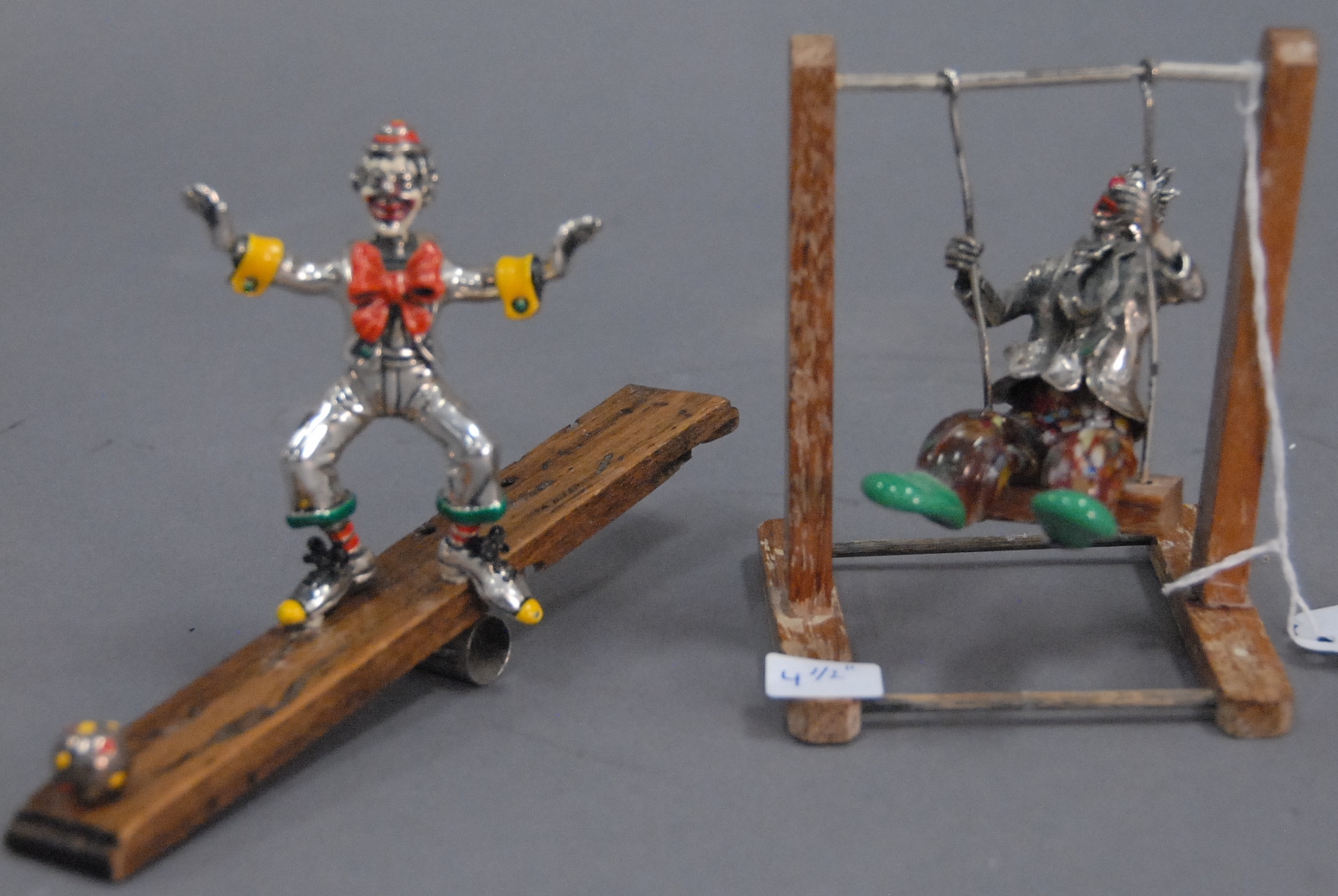 Two piece lot to include Angini Murano glass and silver swinging clown and a sterling enameled balancing clown marked 925 Italy AR.