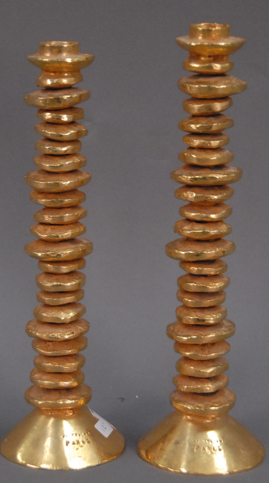 Pair of Galerneau Paris gilt bronze candlesticks marked on base, ht. 12 in.