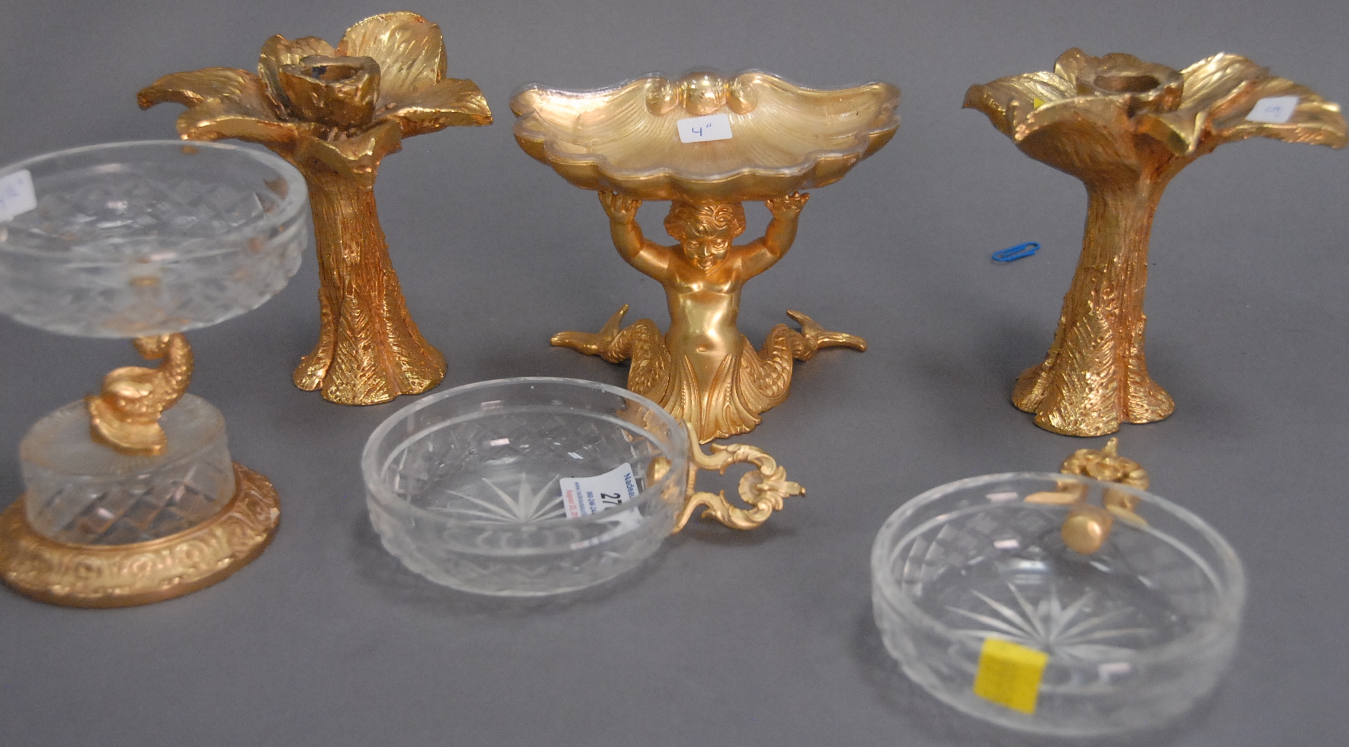 Group of six gilt bronze and glass toiletry items including pair of candlesticks attributed to Galerneau Paris.