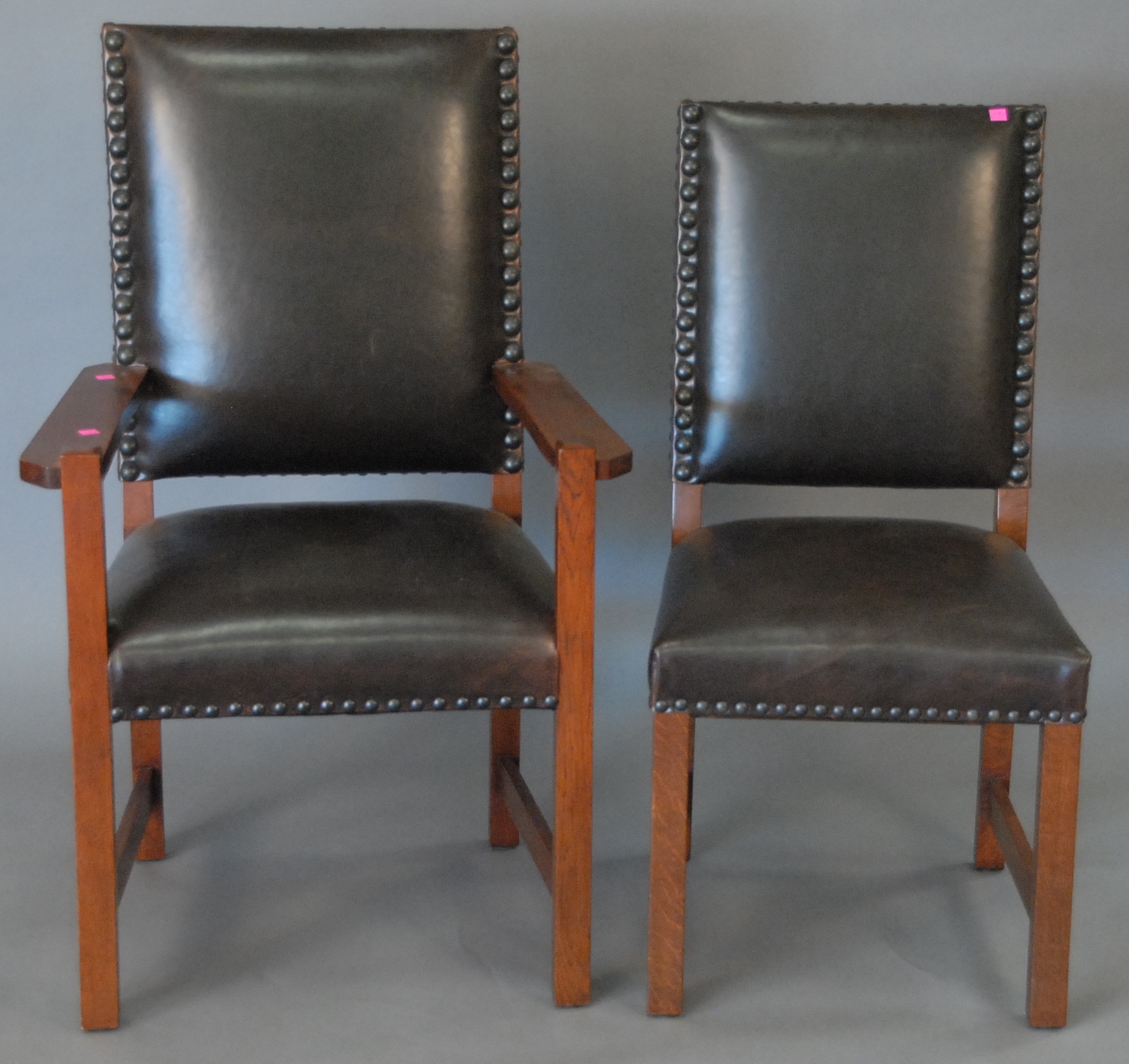 Two Stickley oak and leather chairs to include one armchair and one side chair.
