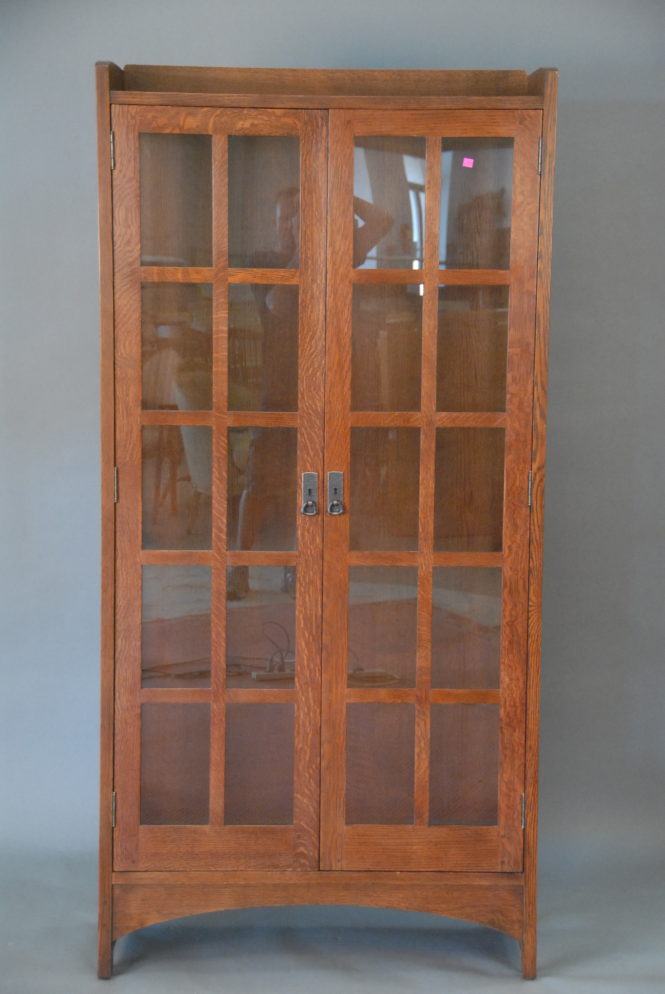 Stickley oak two door cabinet with glass shelves, ht. 78 in. wd. 38 in. dp. 15 in.