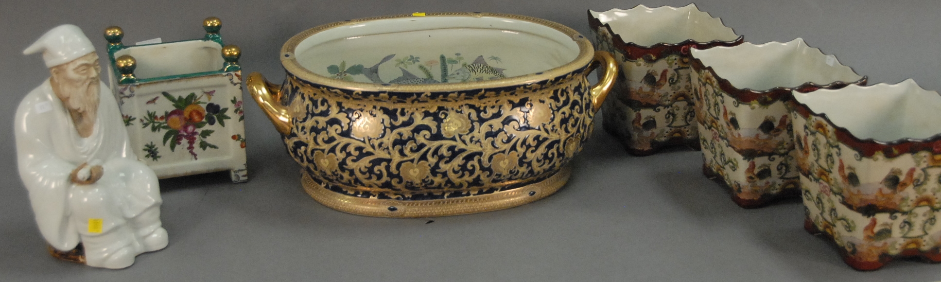 Six piece lot to include Oriental oval fish bowl, four planters, and Little Jones Oriental figure.
