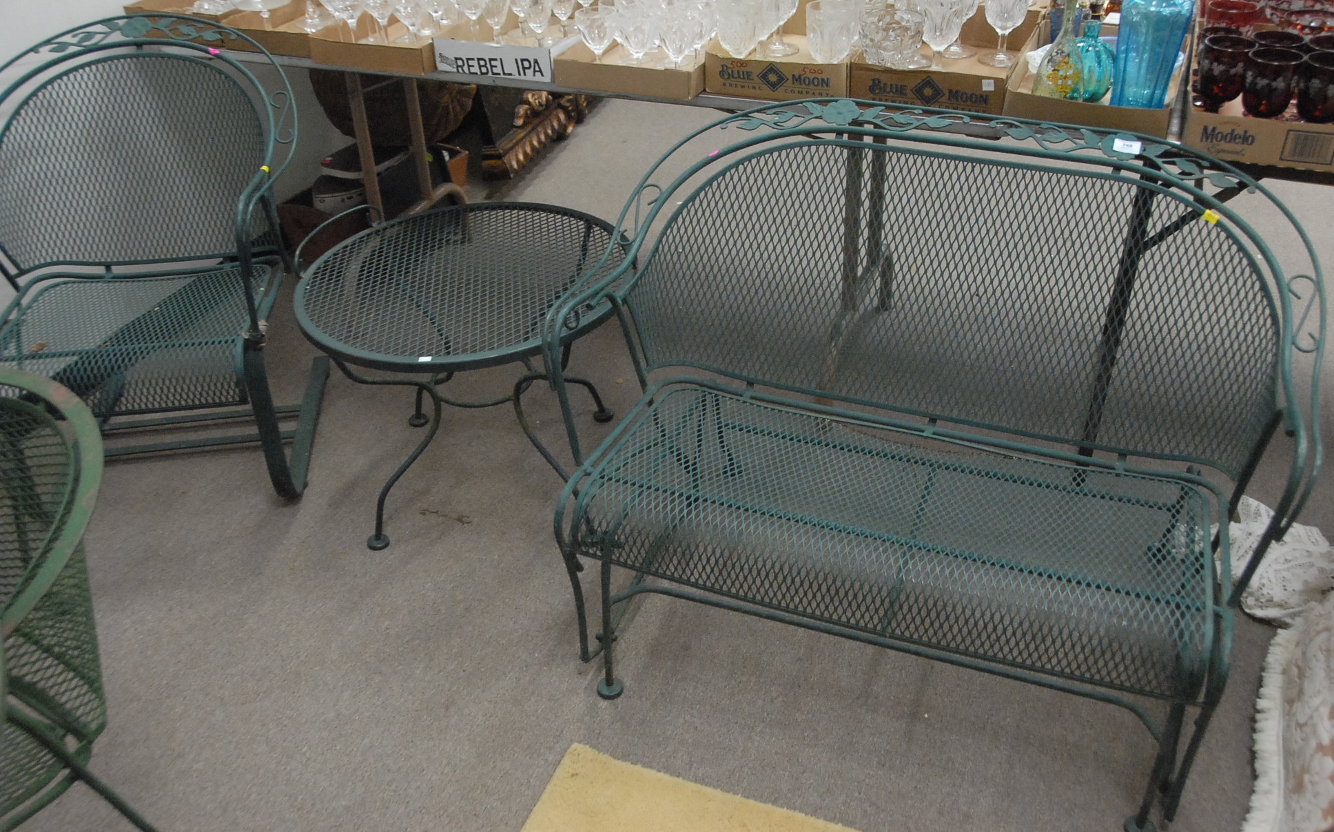 Four piece mesh iron outdoor set including glider chair, bench, and two small tables.