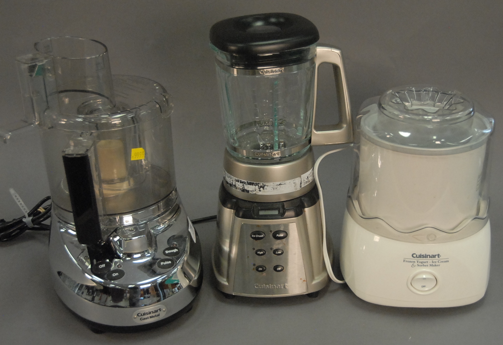 Three piece lot to include Cuisinart cast metal food processor, Cuisinart blender, and Cuisinart frozen yogurt ice cream maker.