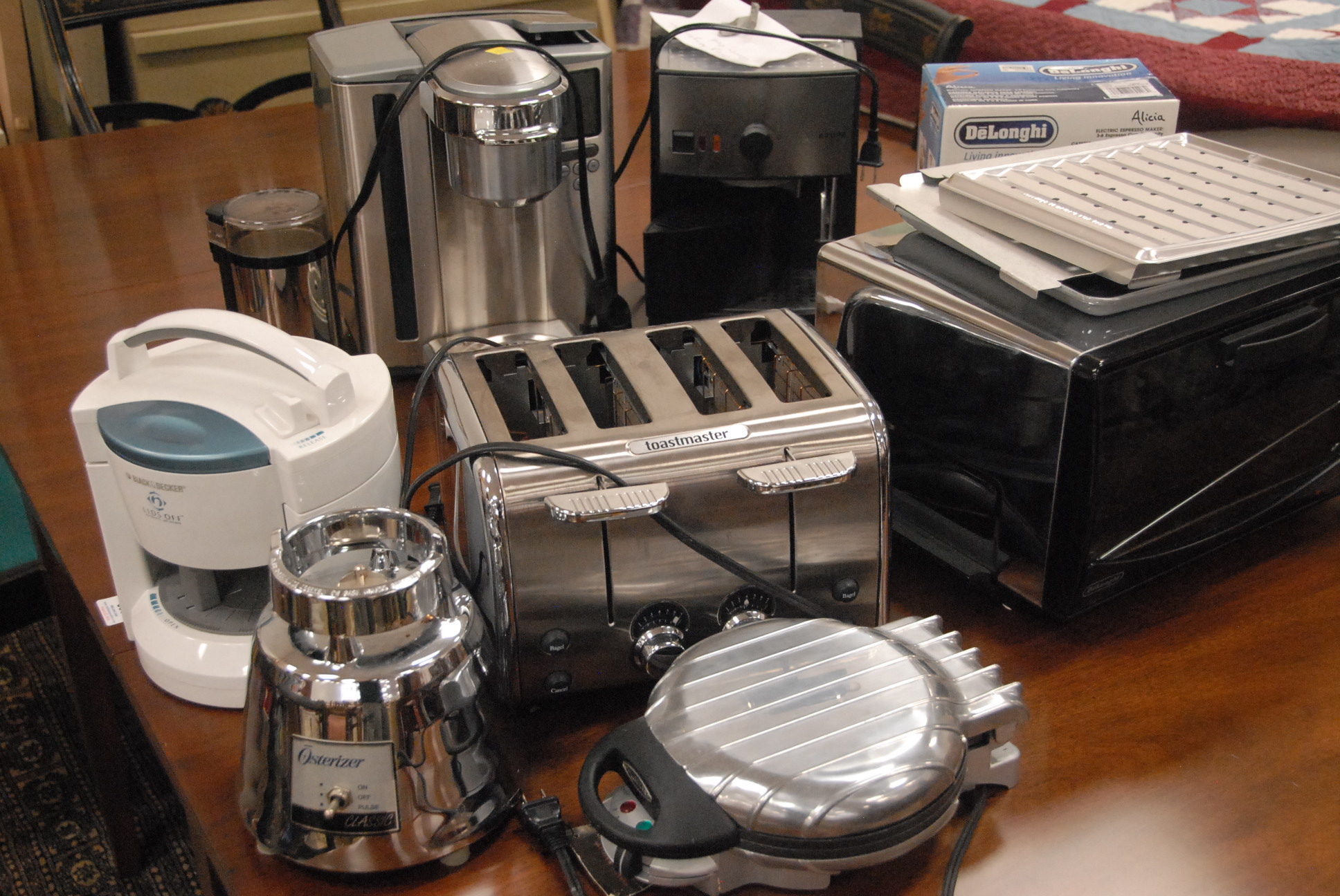 Eight piece kitchen group to include Breville and Krups coffee makers, Black & Decker lids off, Osterizer blender base, DeLonghi toaster oven, Villaware cooker, and a toaster.