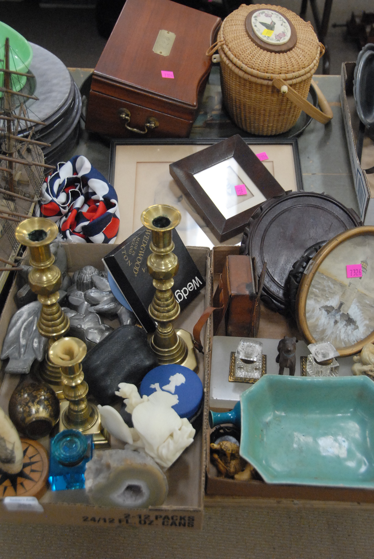 Group of small items to include oval watercolor of lighthouse, Oriental bowl, two Netsukes, inkwell, three brass candlesticks, figural molds, print, ship model, Nantucket style basket, jewelry box, tole tray, etc.