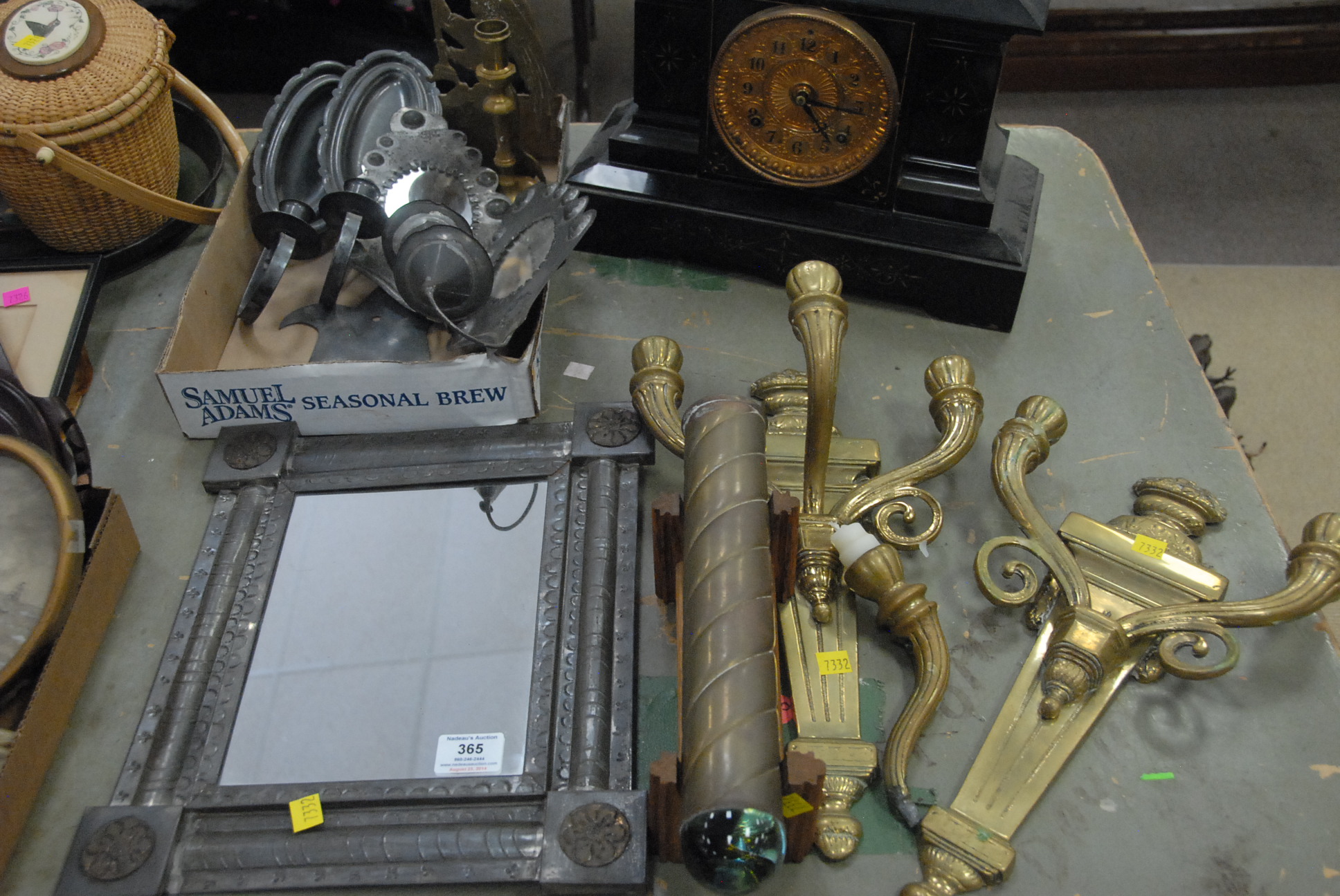 Group lot to include tin, brass candle sconces, Victorian iron mantle clock, etc.