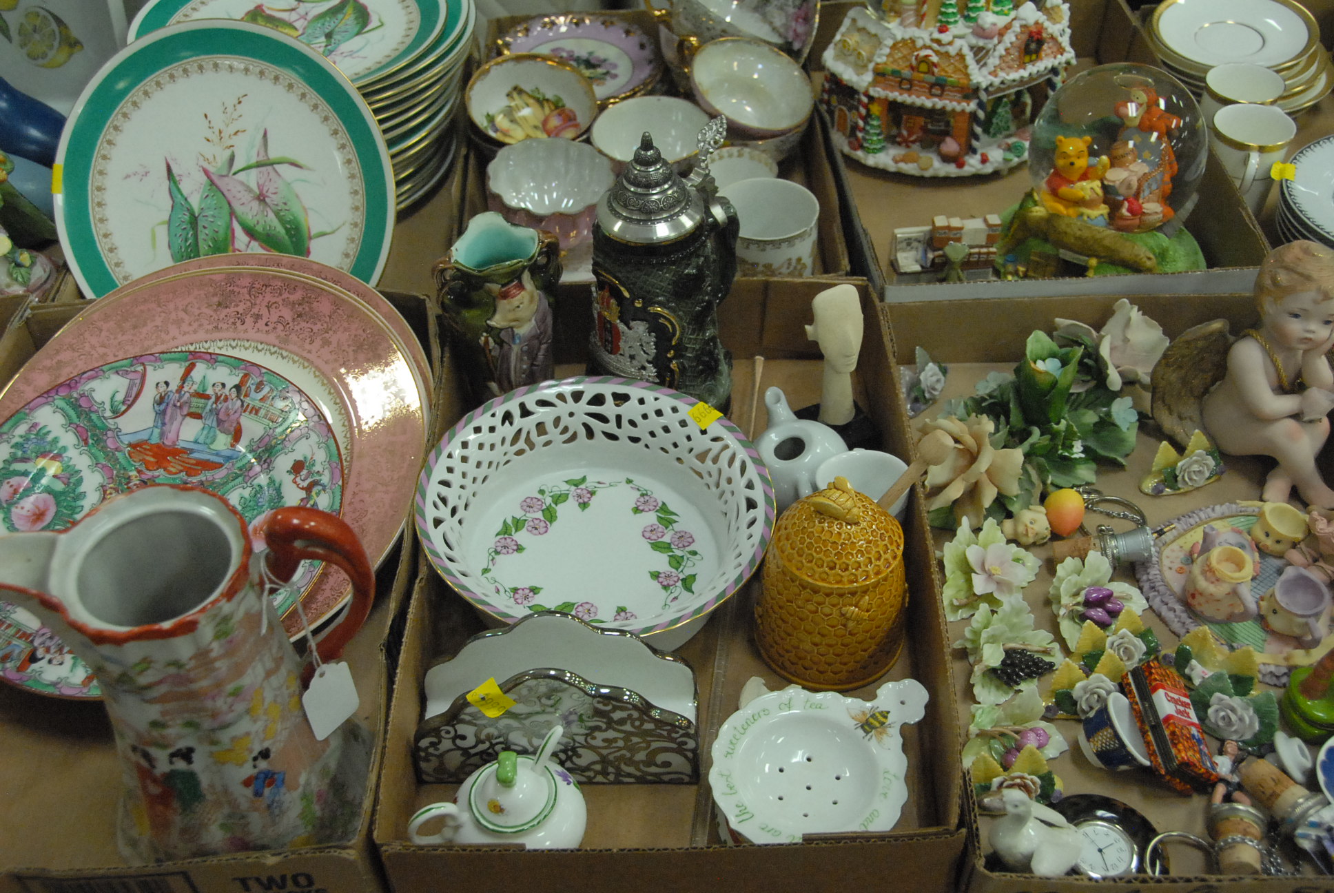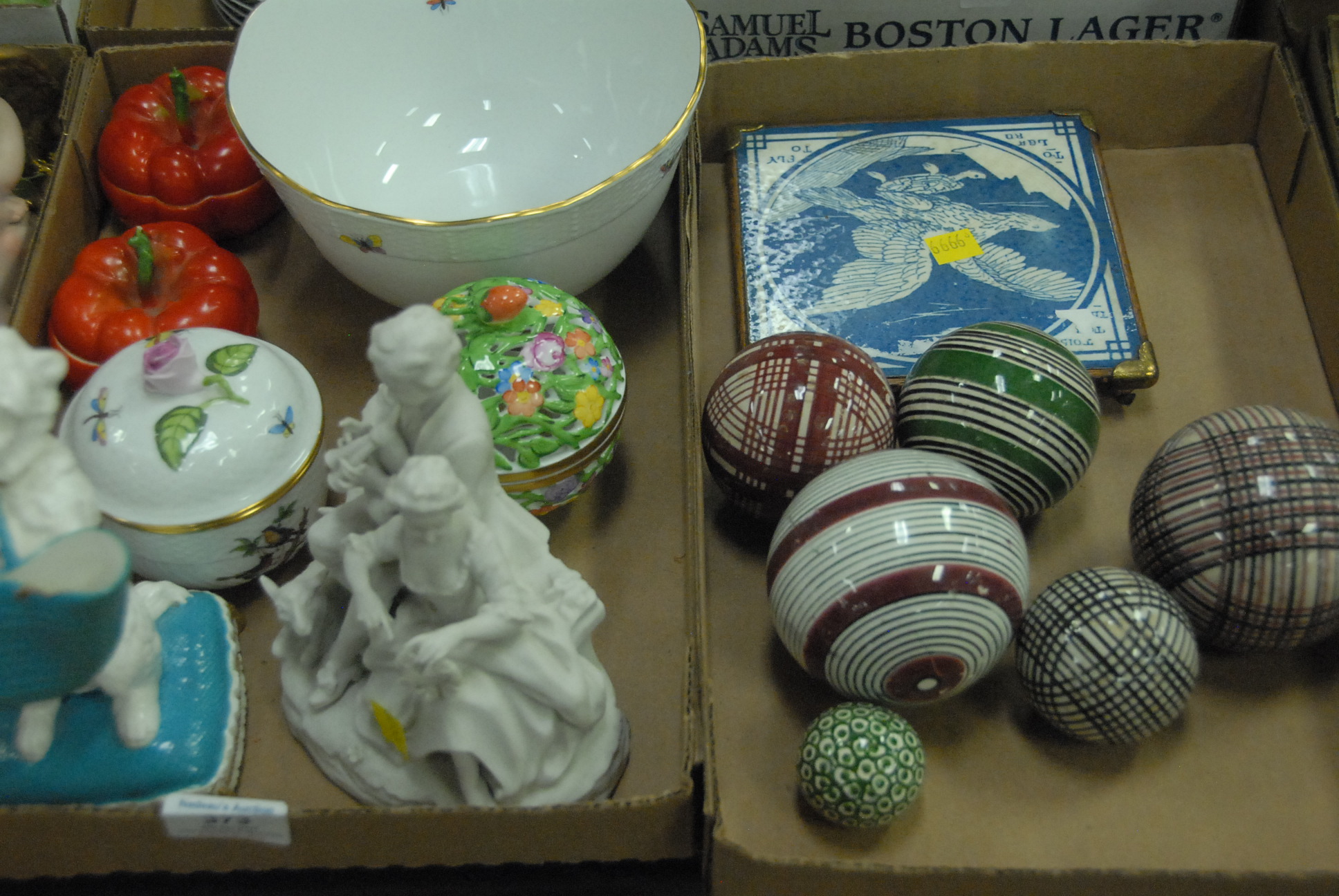 Three box lots to include three Herend pieces, Royal Doulton cups and saucers, two Royal Bayreuth pieces, carpet balls, and Minton tile.