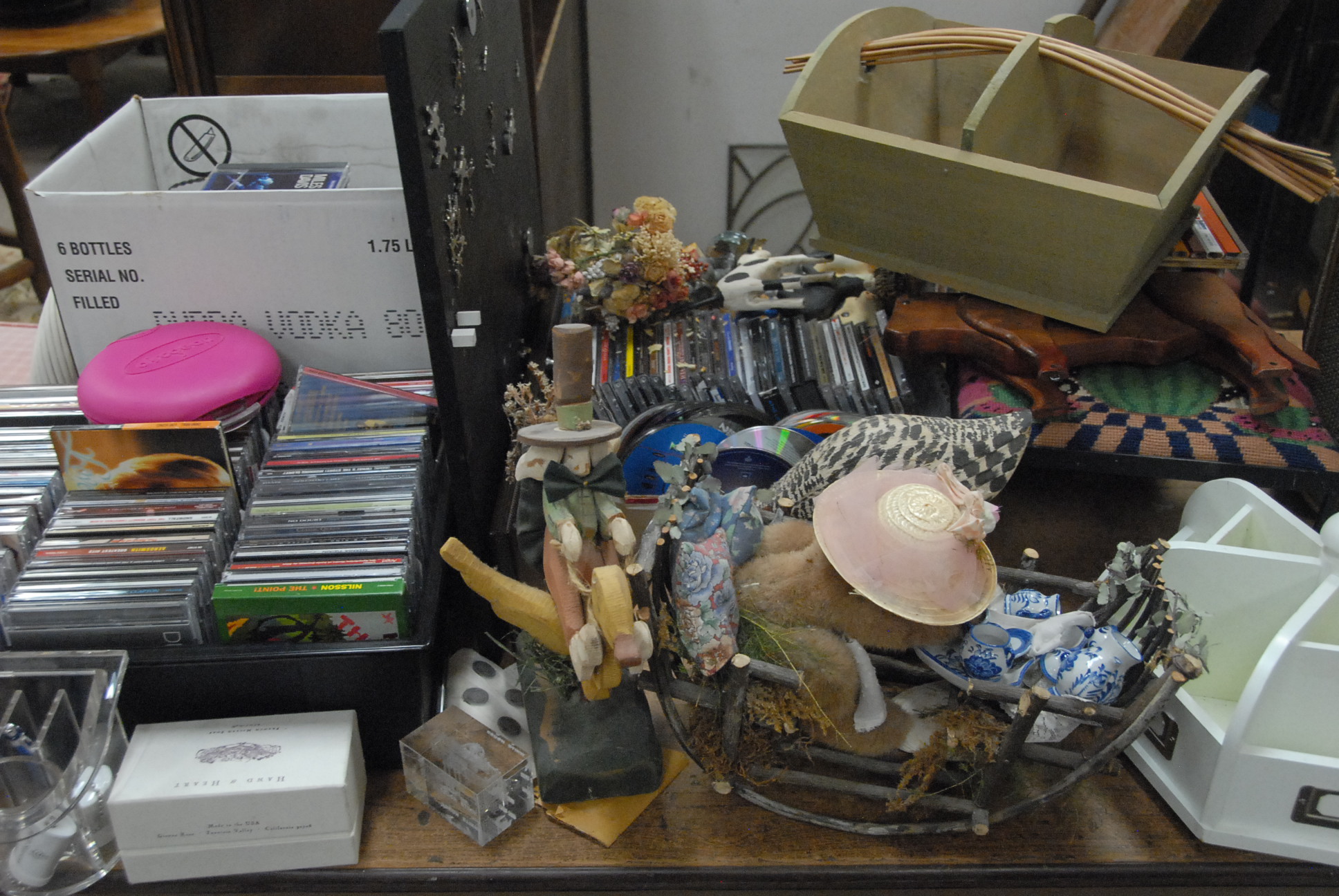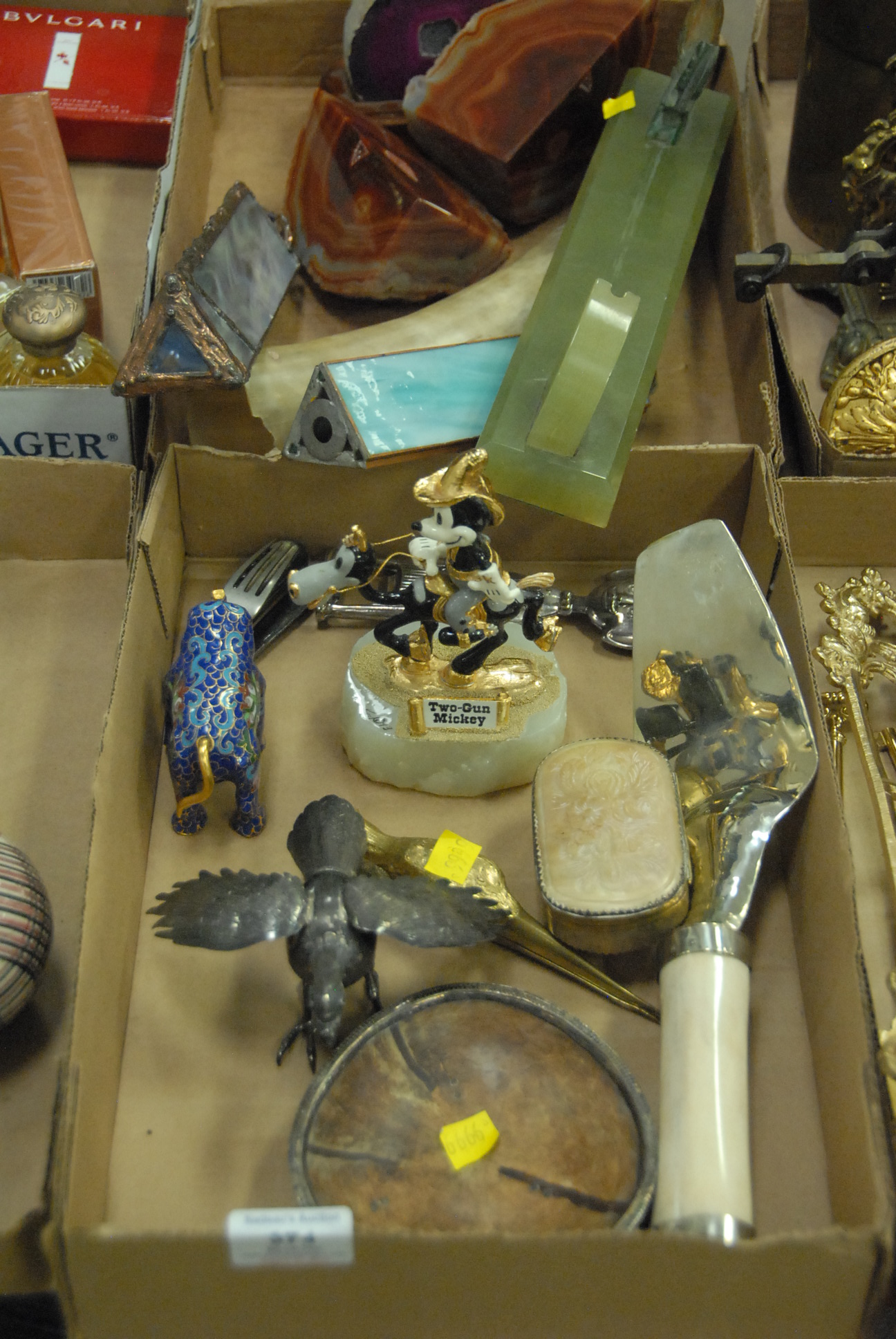 Three box lots to include Two-Gun Mickey, perfumes, silver and bone pie server, pair of stone book ends, etc.