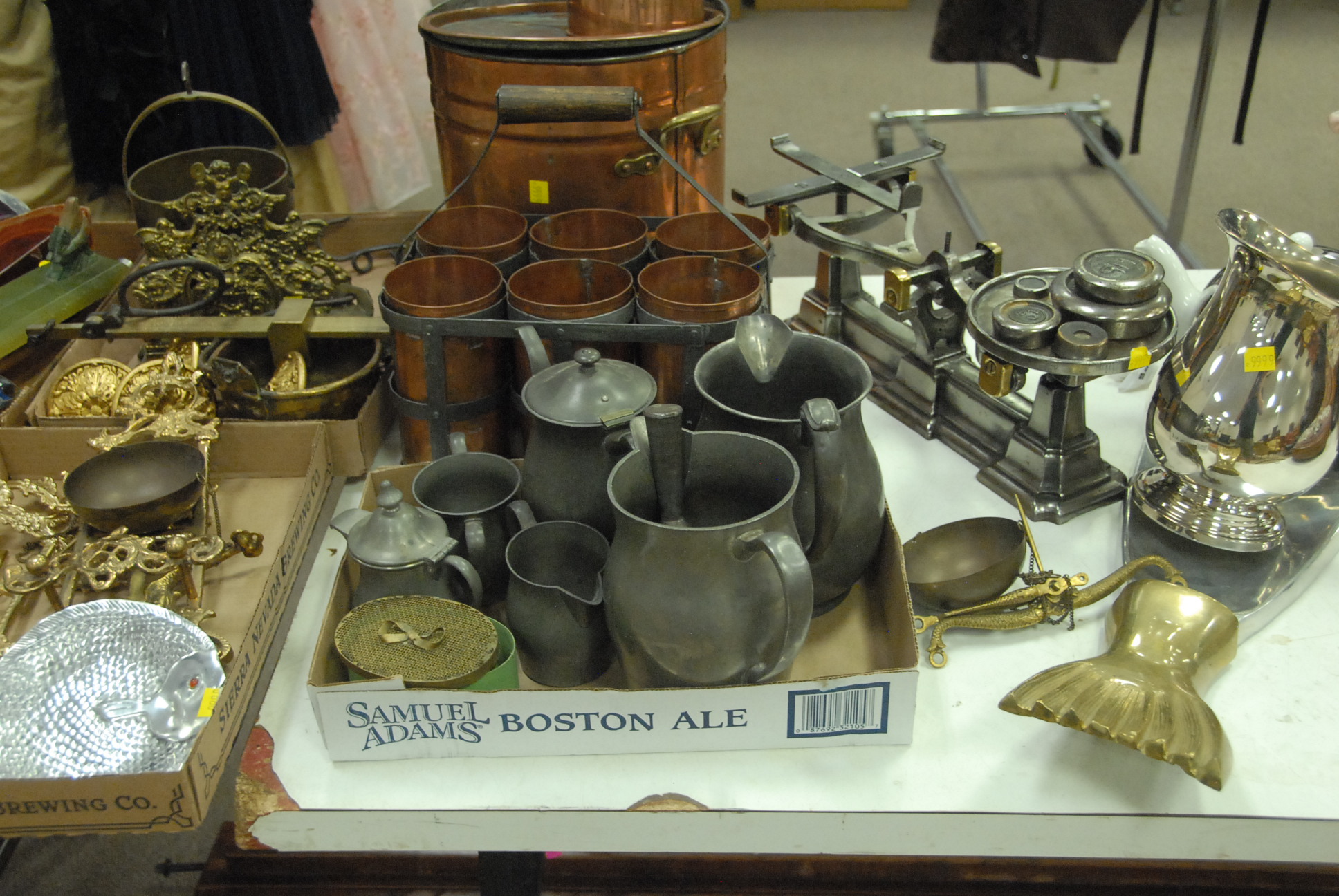 Four box lots to include brass scales, brass letter holder, bells, pewter and brass fish, copper pot, pewter, etc.