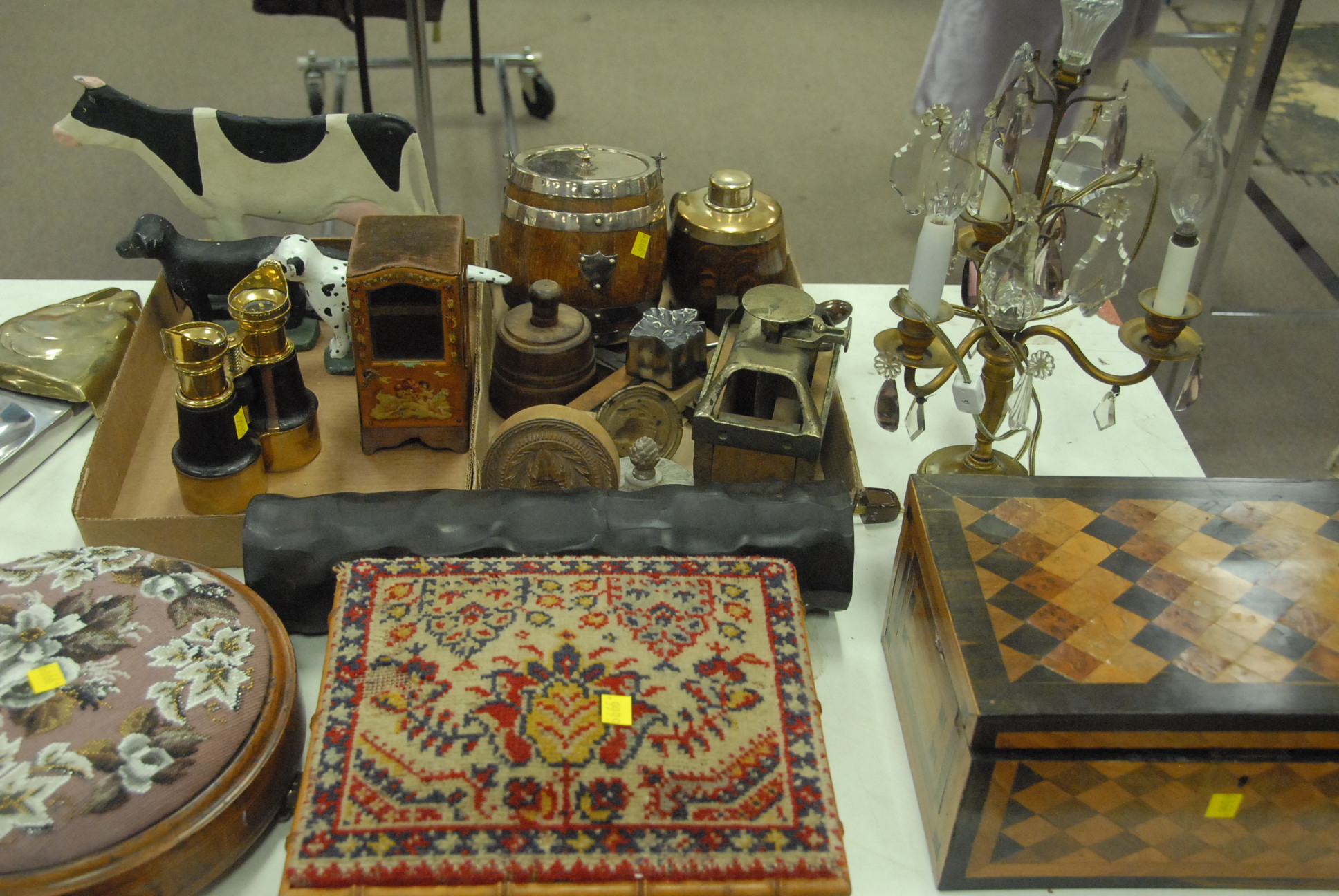 Group lot to include iron door stops, two small stools, inlaid sewing box, etc.