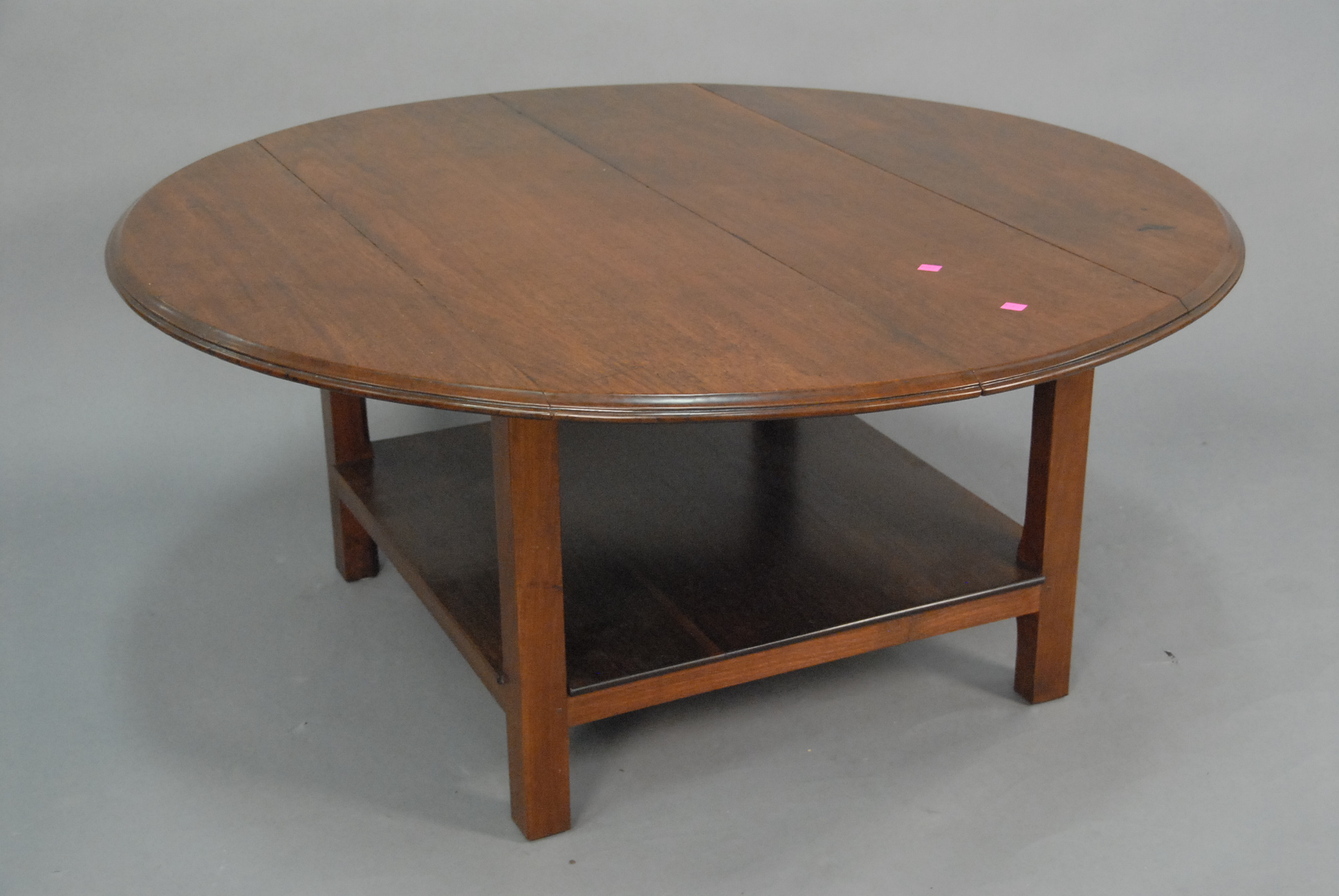 Custom walnut round coffee table, ht. 21 in. dia. 46 in.