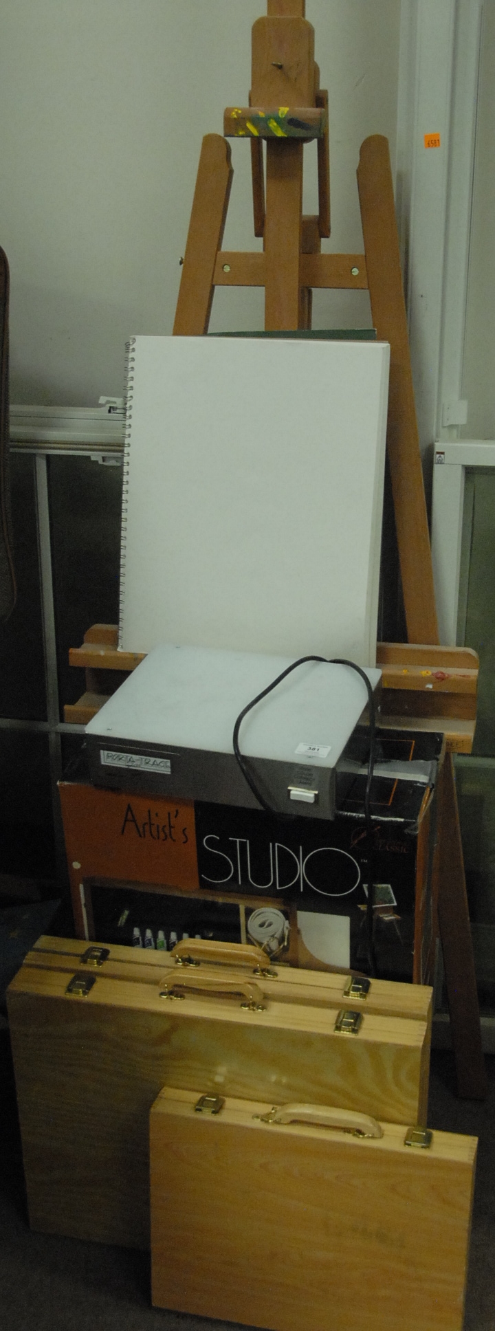 Group of artist items to include an artist’s eisel, porta trace, artist studio paint supplies, etc.