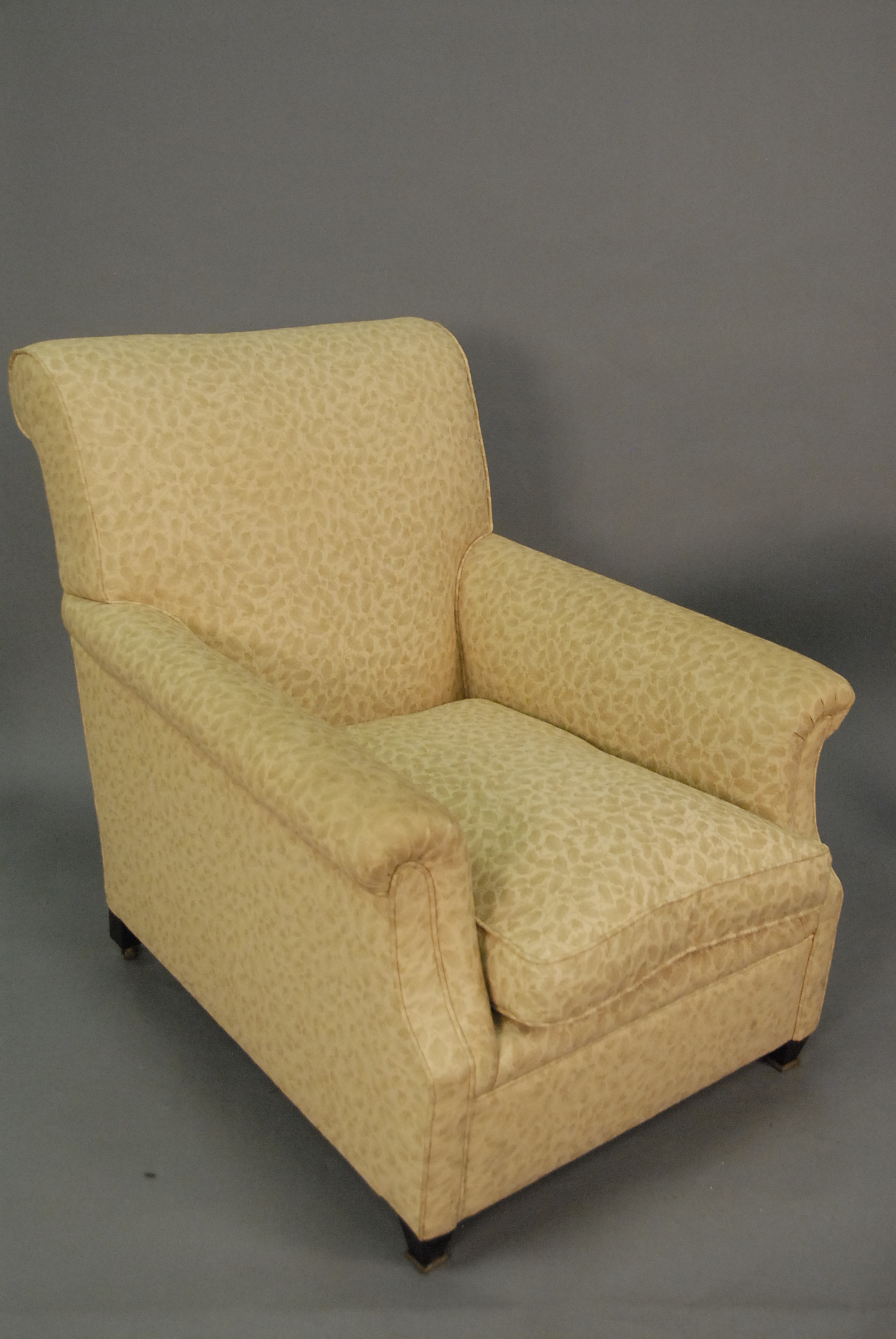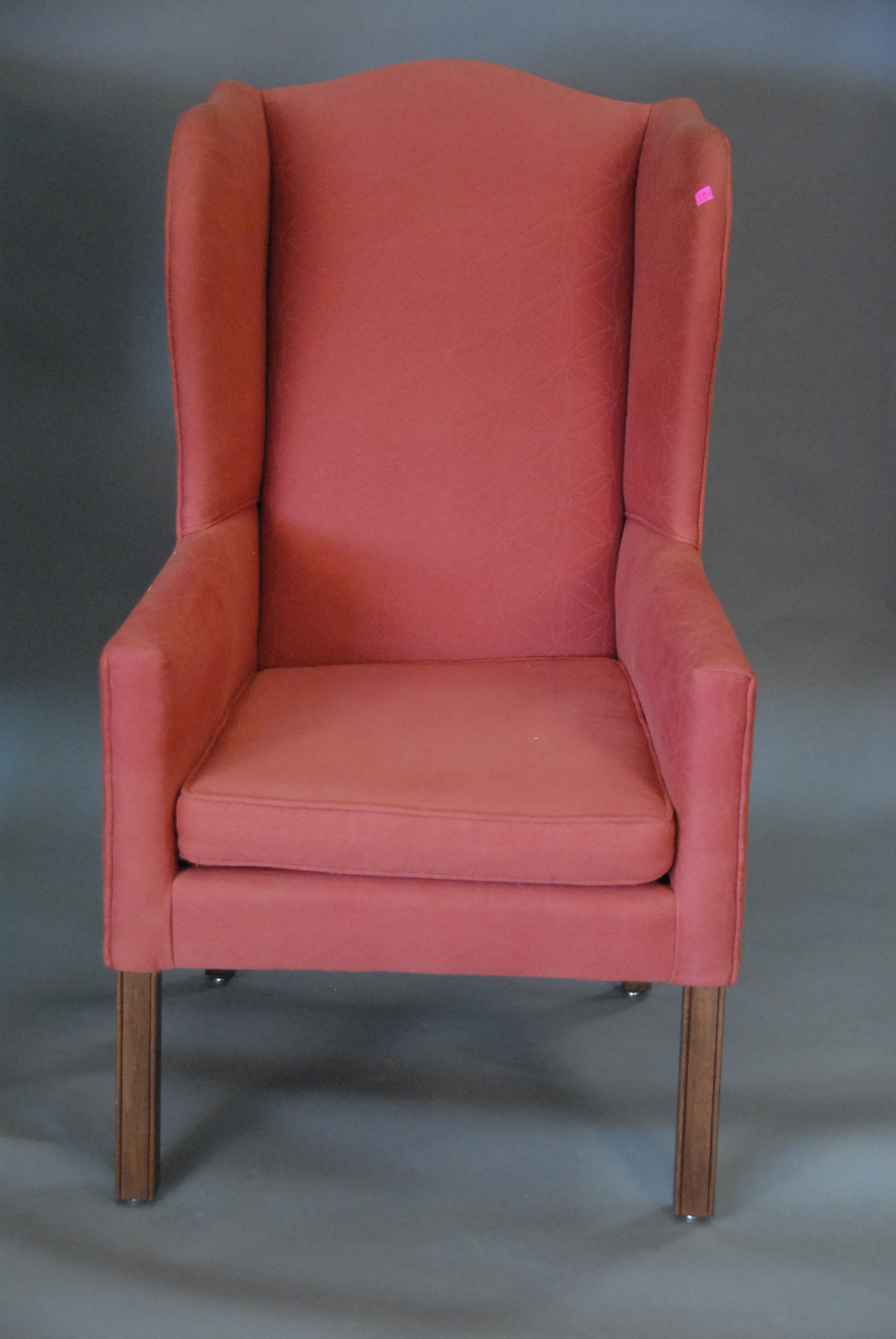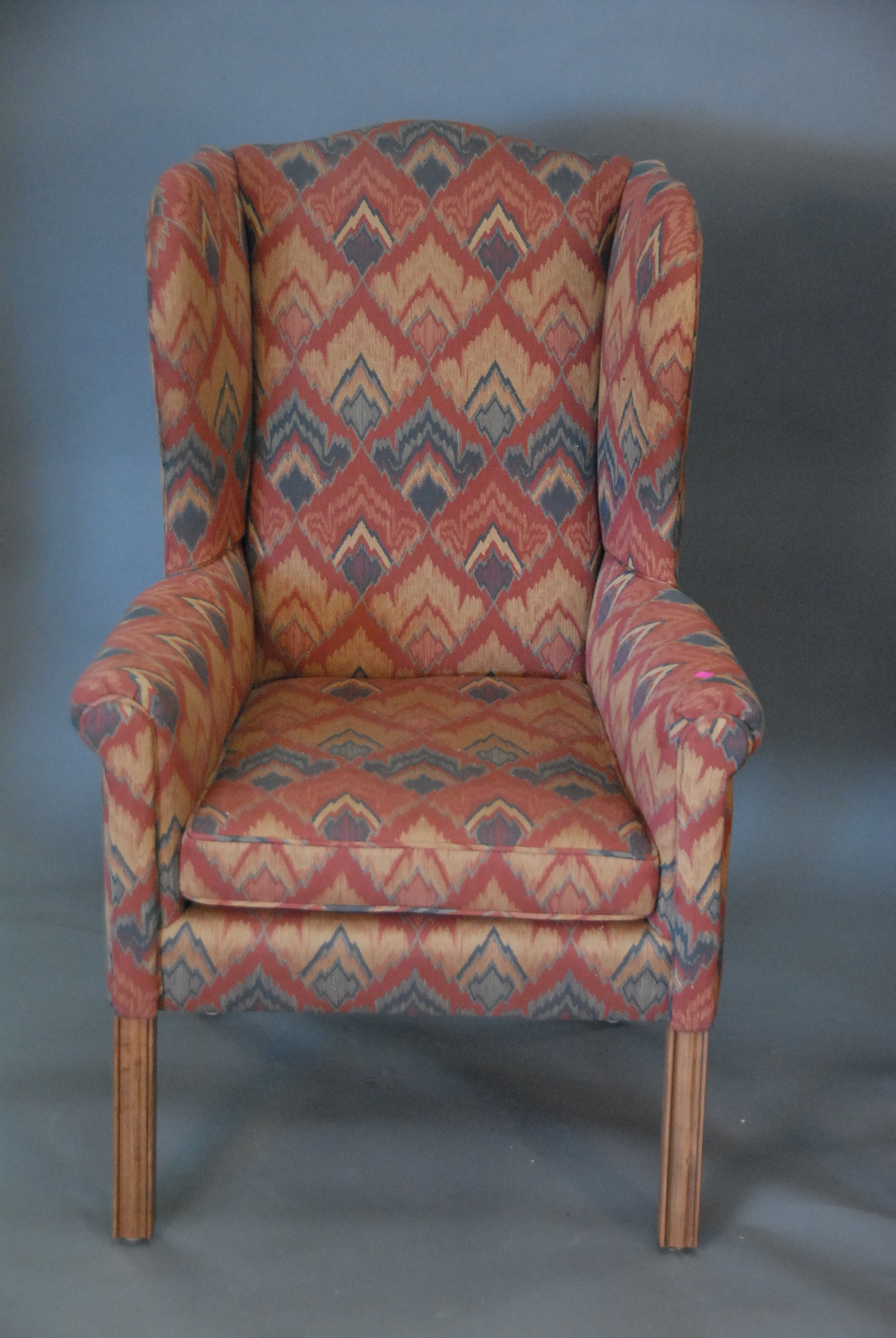 Chippendale style upholstered wing chair and footstool marked Bartley Collection.