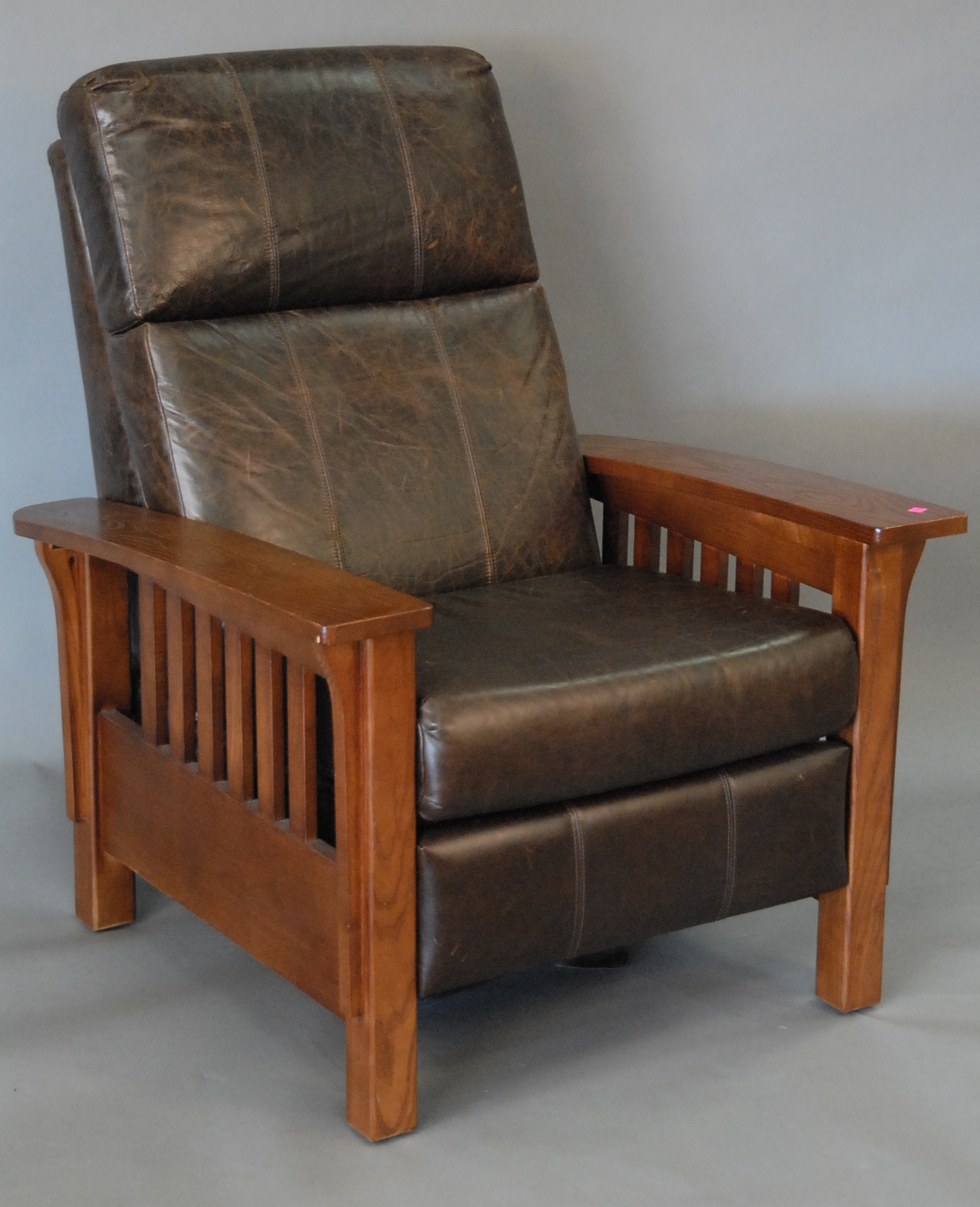 Mission style oak and leather reclining chair, wd. 33 1/2.