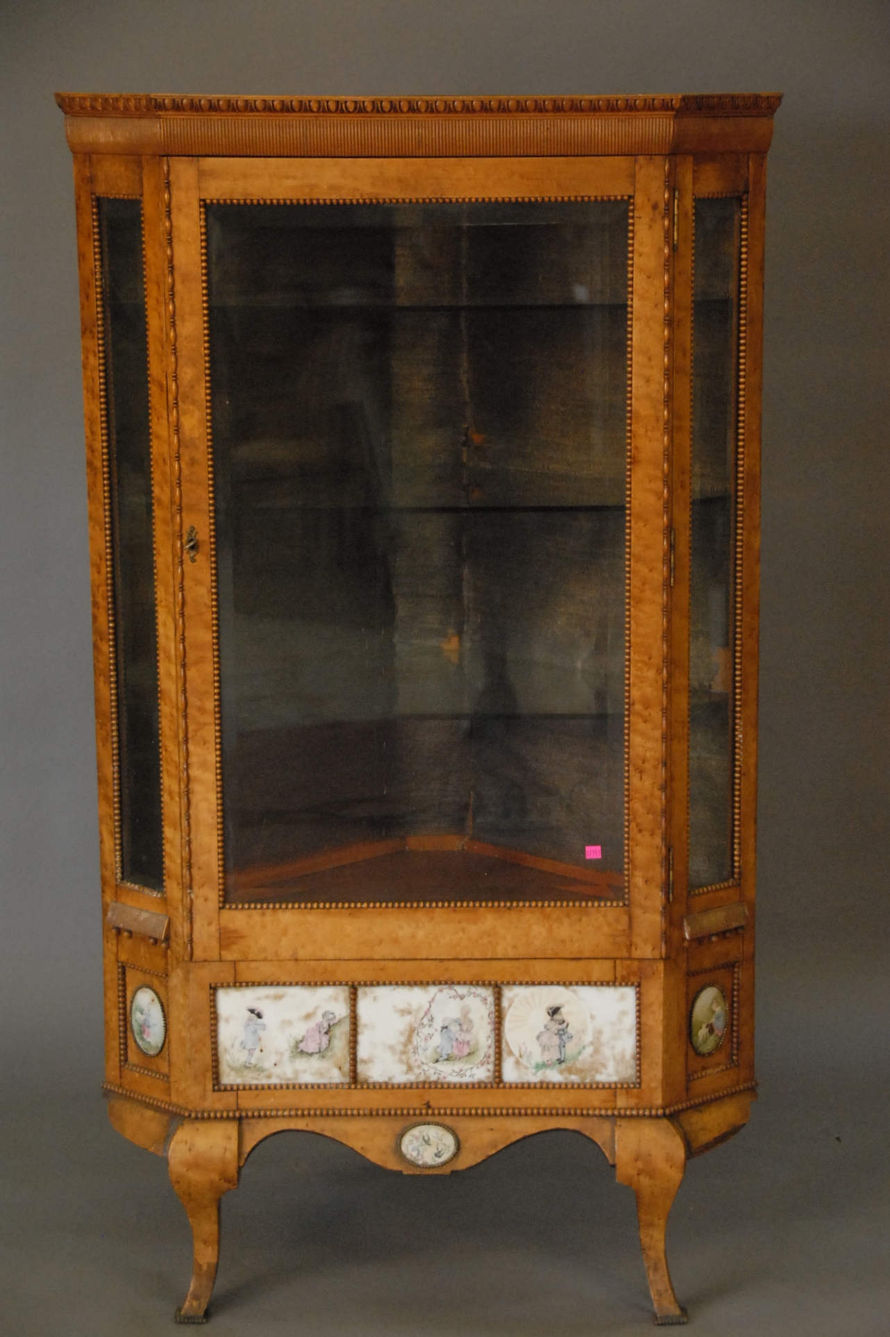 Birdseye maple corner china cabinet mounted with porcelain panels, ht. 64, wd. 37.