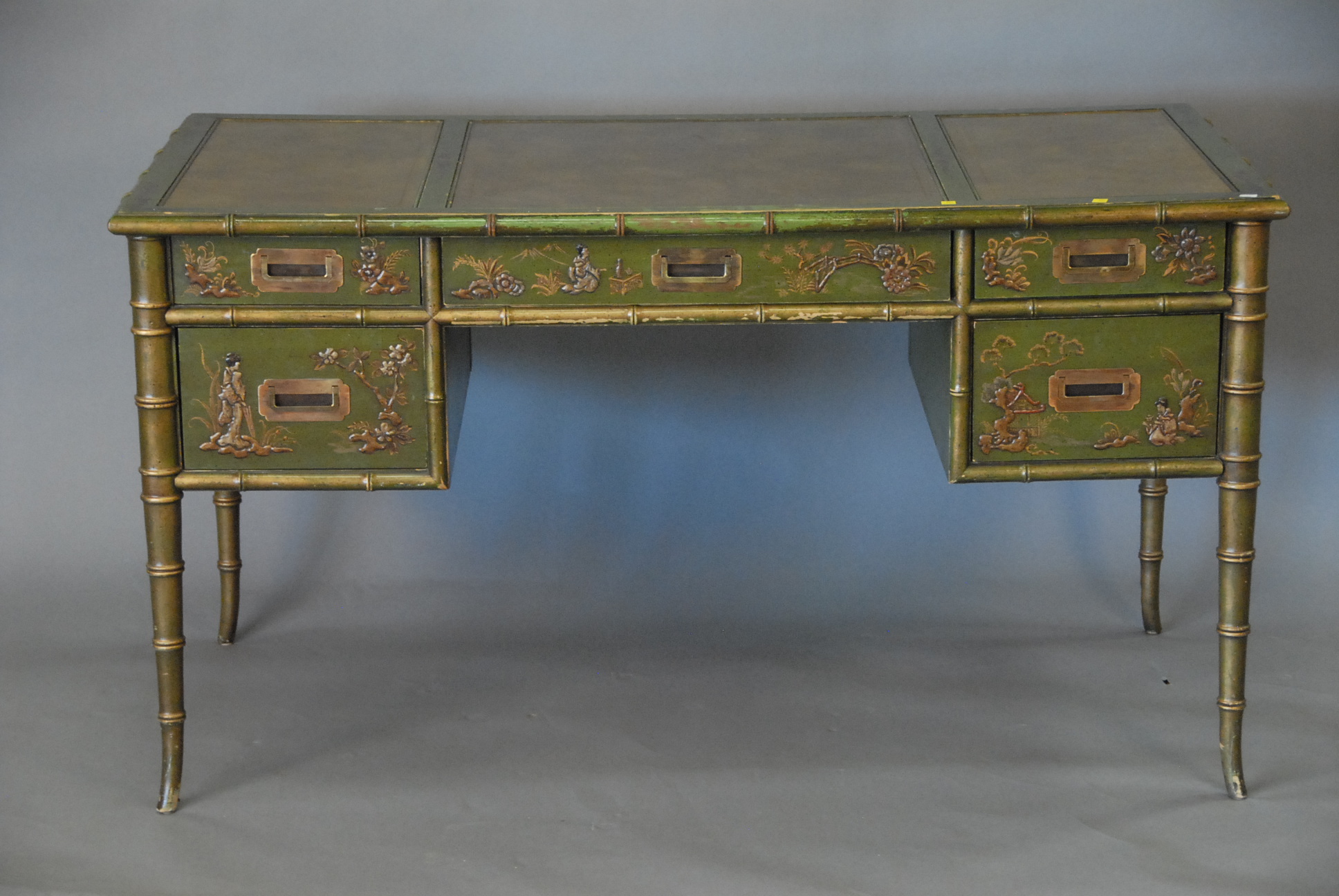 Chinoiserie decorated writing desk with three panel leather top, ht. 29 1/2 in. lg. 54 in.