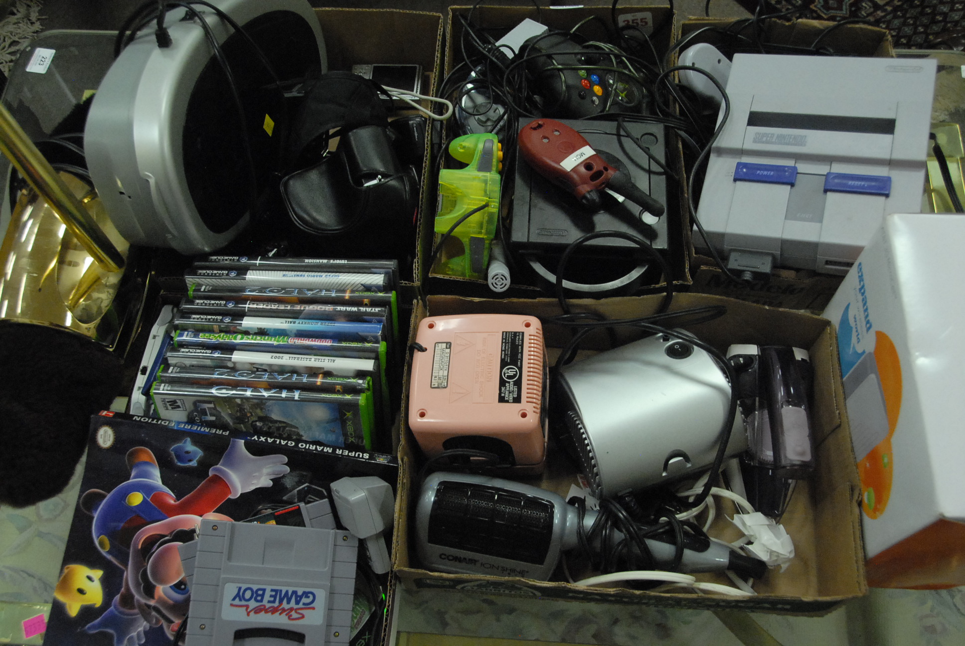 Group of electronics to include alarm clocks, walkie talkie, Game Cube, Super Nintendo, 3 Micro Cell cameras, games, and shoe shine.