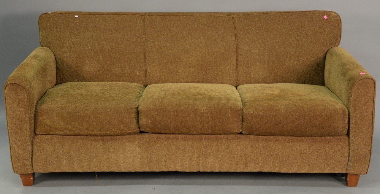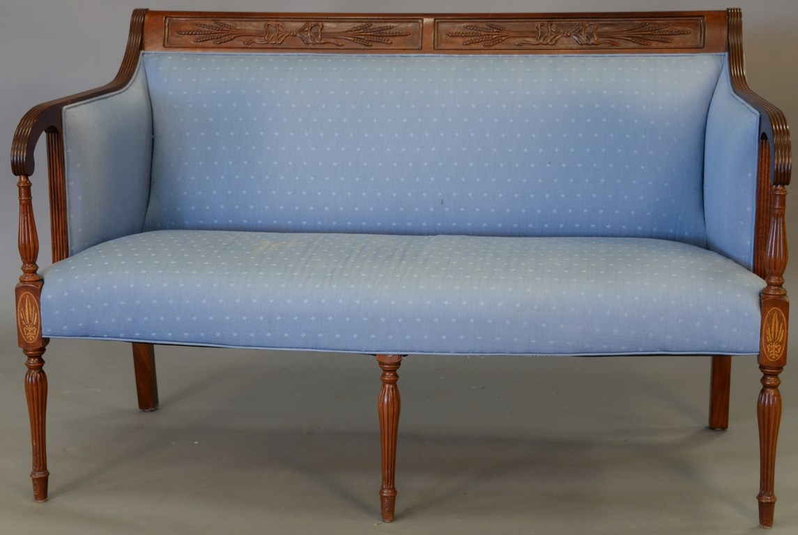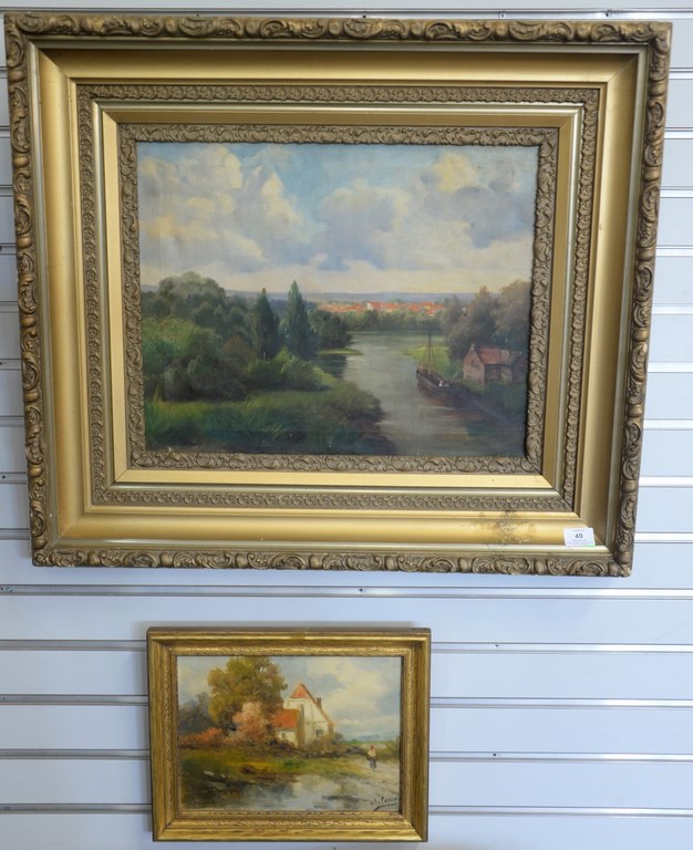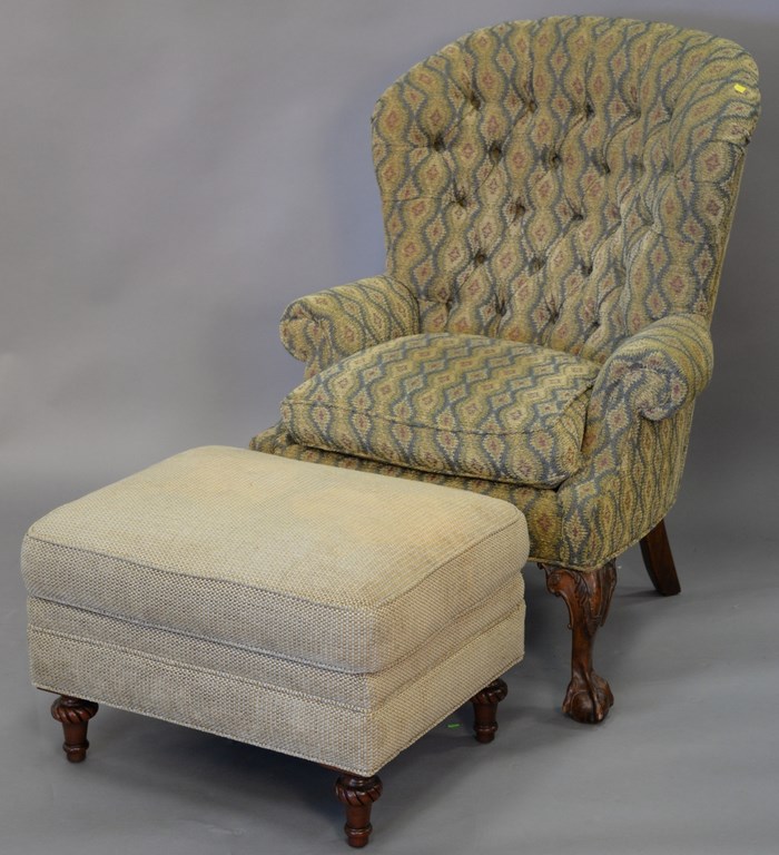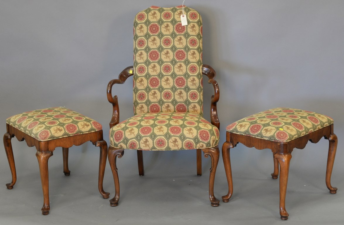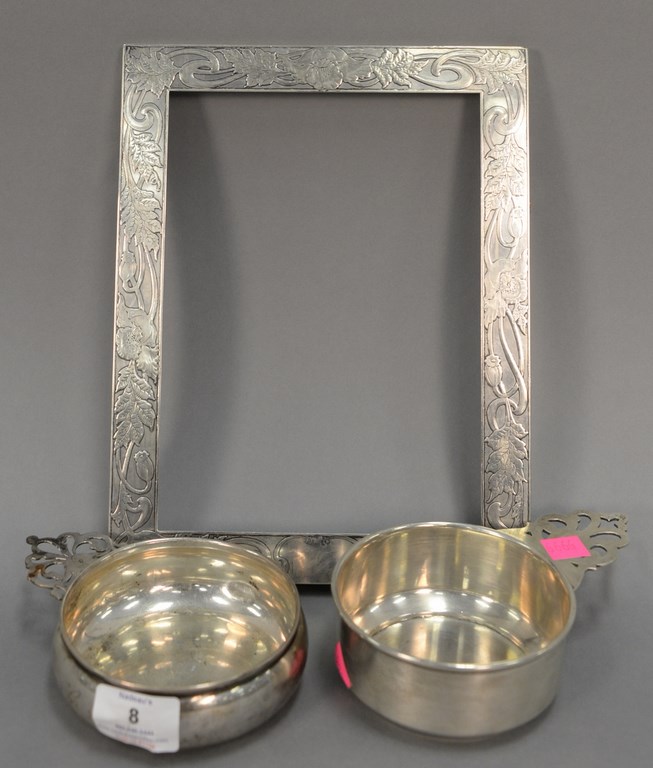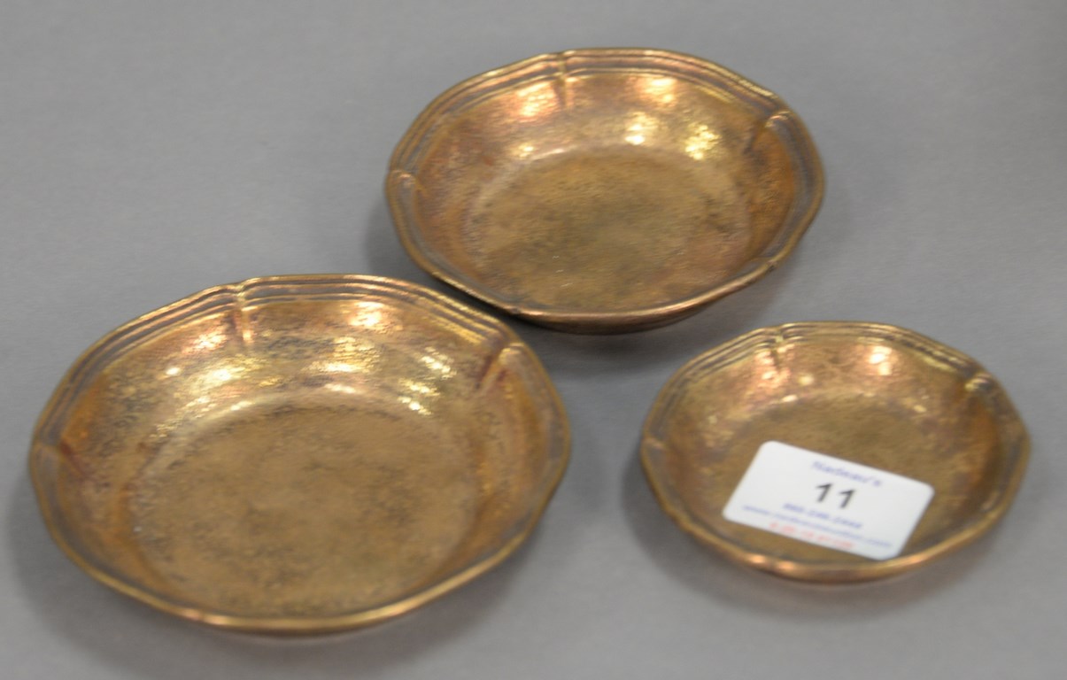 Three Chinese porcelain blue and white bowls, one with scrolling blossoming flowers having seal mark on bottom, ht. 3 1/2 in., dia. 7 in. one with scrolling leaves and six character mark on bottom, ht. 2 3/4 in., dia. 6 in. and the largest bowl having painted trees with leaves and six character mark on the bottom, ht. 3 1/2 in., dia. 8 1/2 in.