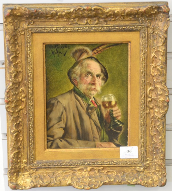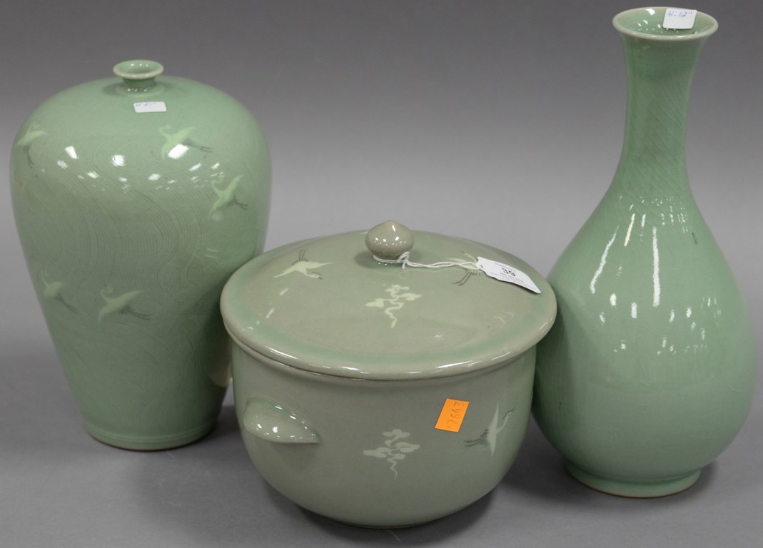 Four piece Oriental group to include two Celadon vases, one with swans along with an Oriental scroll having Bamboo trees and a monkey and a Celadon covered serving dish, hts. 7-12.