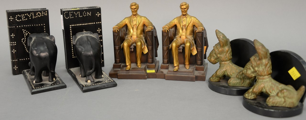 Three pairs of bookends including Abraham Lincoln bookends by Jennings Bros. #2440 ht. 6 1/2 in., pair of dog bookends ht. 4 in., and a pair of carved elephant bookends ht. 6 1/2 in.