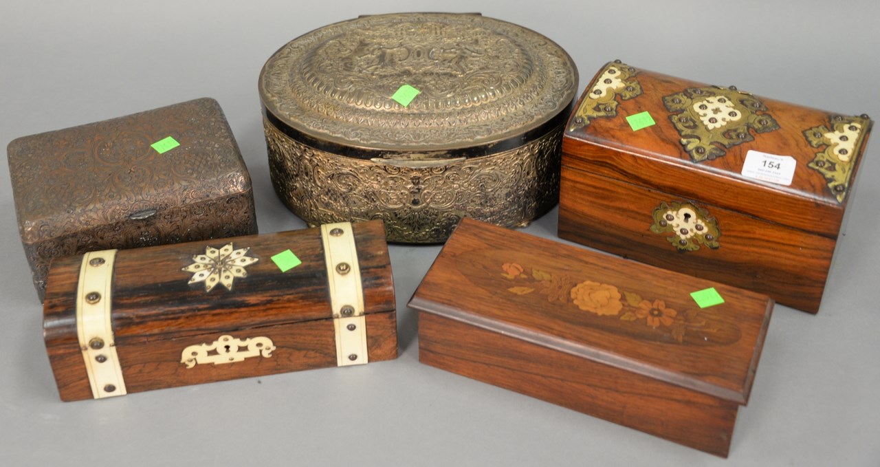 Group of five lift top boxes including rosewood cigar box, burlwood tea caddy mounted with brass and bone, rosewood dome top box and two silverplated boxes. smallest: ht. 3 1/2 in. wd. 7 1/2 in., largest: ht. 4 1/2 in. wd. 12 in.