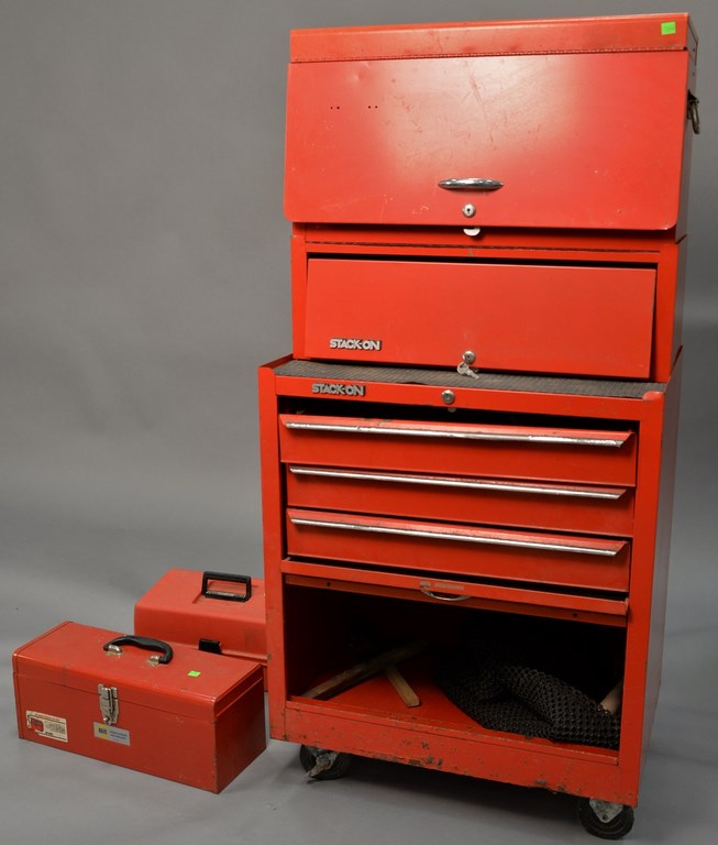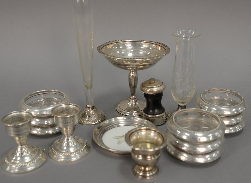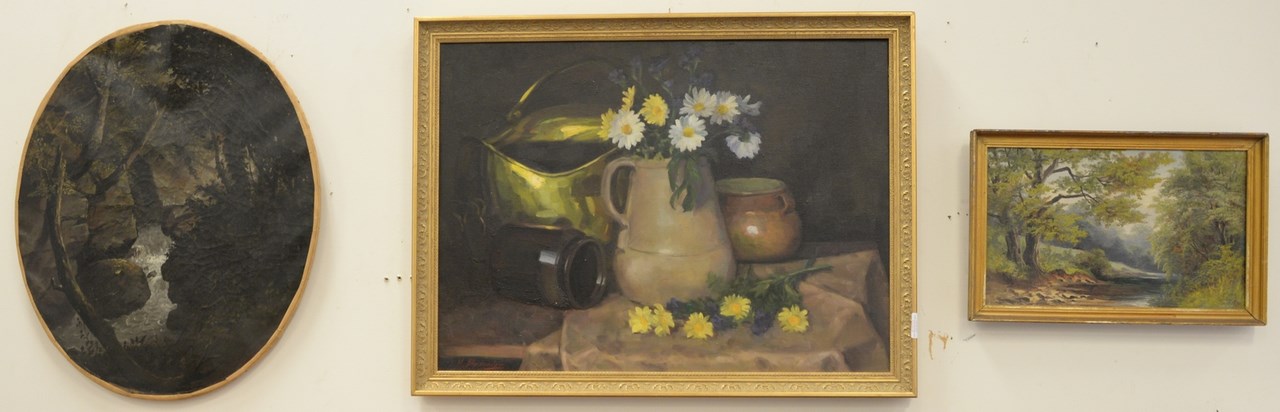 Three oil on canvas paintings including still life of flowers with crock and brass pail on table signed lower left M. Besunder, a small landscape with stream, and an oval landscape with stream. smallest: 9 1/2 x 16, largest: 20 x 27 1/2