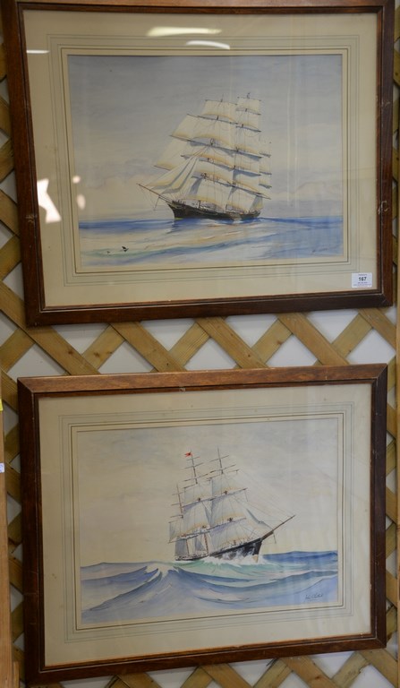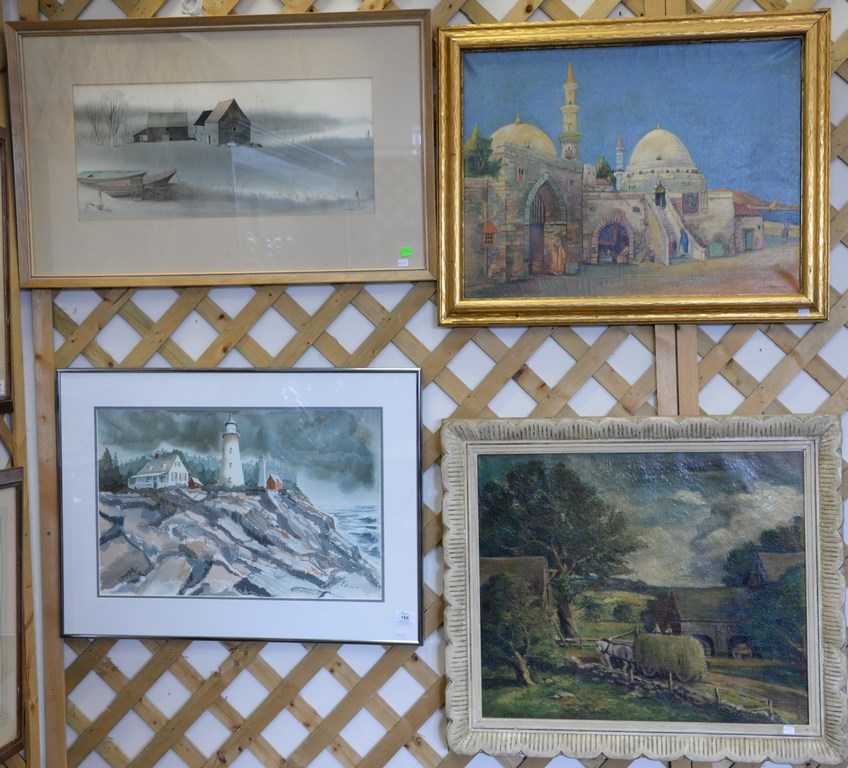 Four paintings including oil on canvas painting by Lorraine Brockway of Moroccan landscape signed lower right Lorraine Brockway 1934 18 x 24, an oil on canvas of farm landscape by Hillard Smith 19 x 23, watercolor of lighthouse by Brobeck 14 x 21, and winter farm watercolor by Courjon 10 x 22.