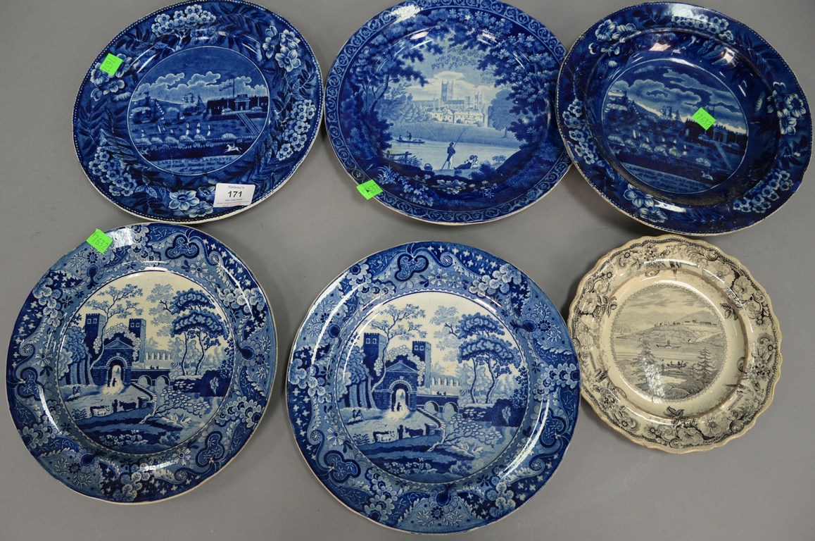 Six piece Clews Staffordshire group of historical Landing of La Fayette plate and bowl as is blue and white The Gate of Sebastian. smallest: dia. 7 1/2 in., largest: dia. 10 in.