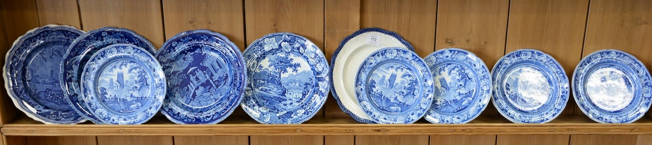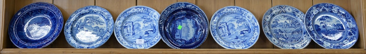 Eight Historic blue Staffordshire plates and bowls Marine Hospital Louisville Kentucky 3 crack, Vue De Chateau Ermenonville bowl, italian Scenery Castle of Lavenza bowl, Hamilton Store plate, Adam’s Blenheim Oxfordshire, and three plates not marked. smallest: dia. 8 1/ 2in., largest: dia. 10 in.
