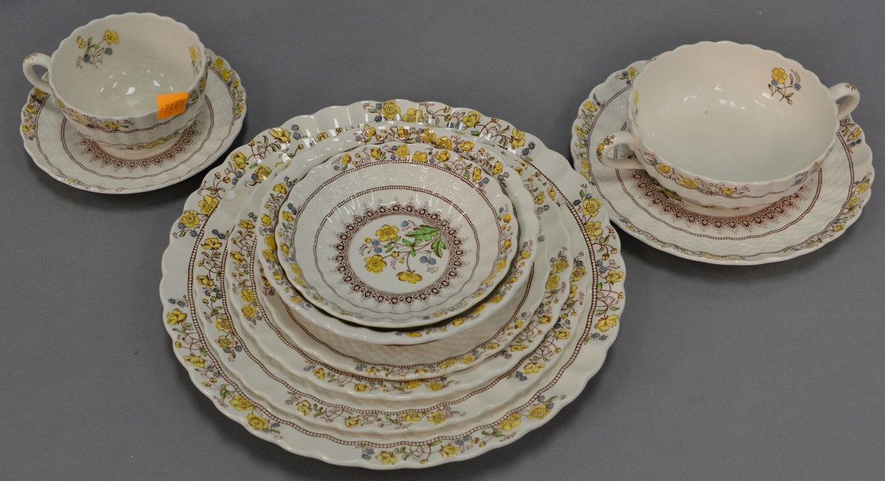 Group of thirteen Staffordshire plates including Thornton Castle, three Asian blue and white, Leeds plate, and set of 8 luncheon plates, dia. 9 in. to dia. 10 in.