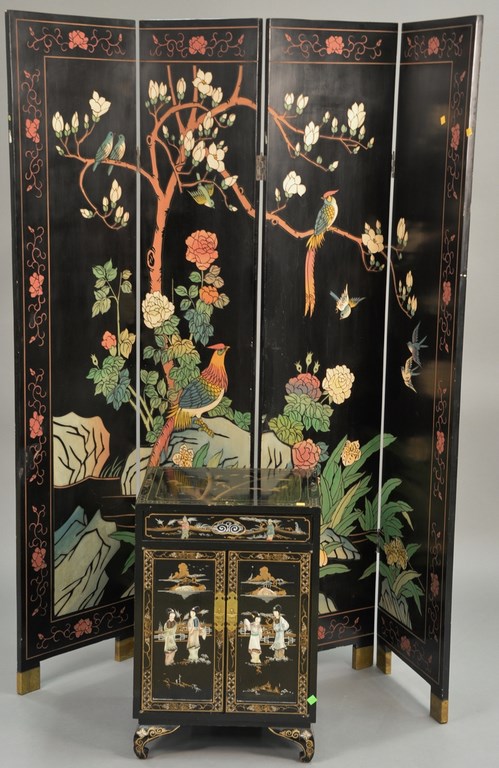 Group lot to include four fold dressing screen, Oriental stand, and two Oriental hanging plaques. plaques: 36 x 14, stand: ht. 26 in. wd. 18 in., screen: ht. 72 in. wd. 64 in.