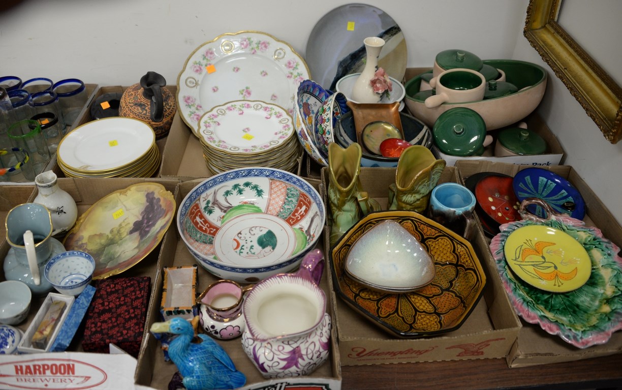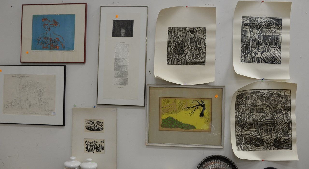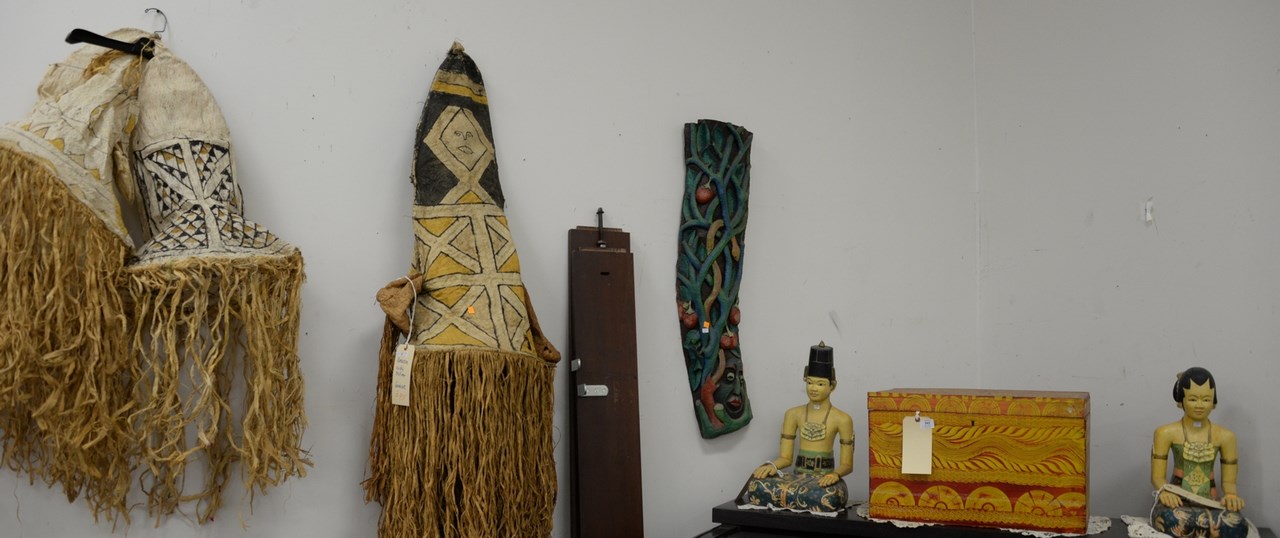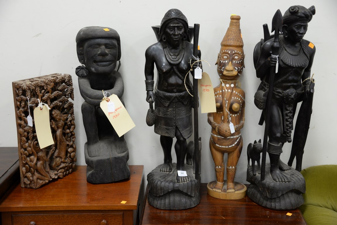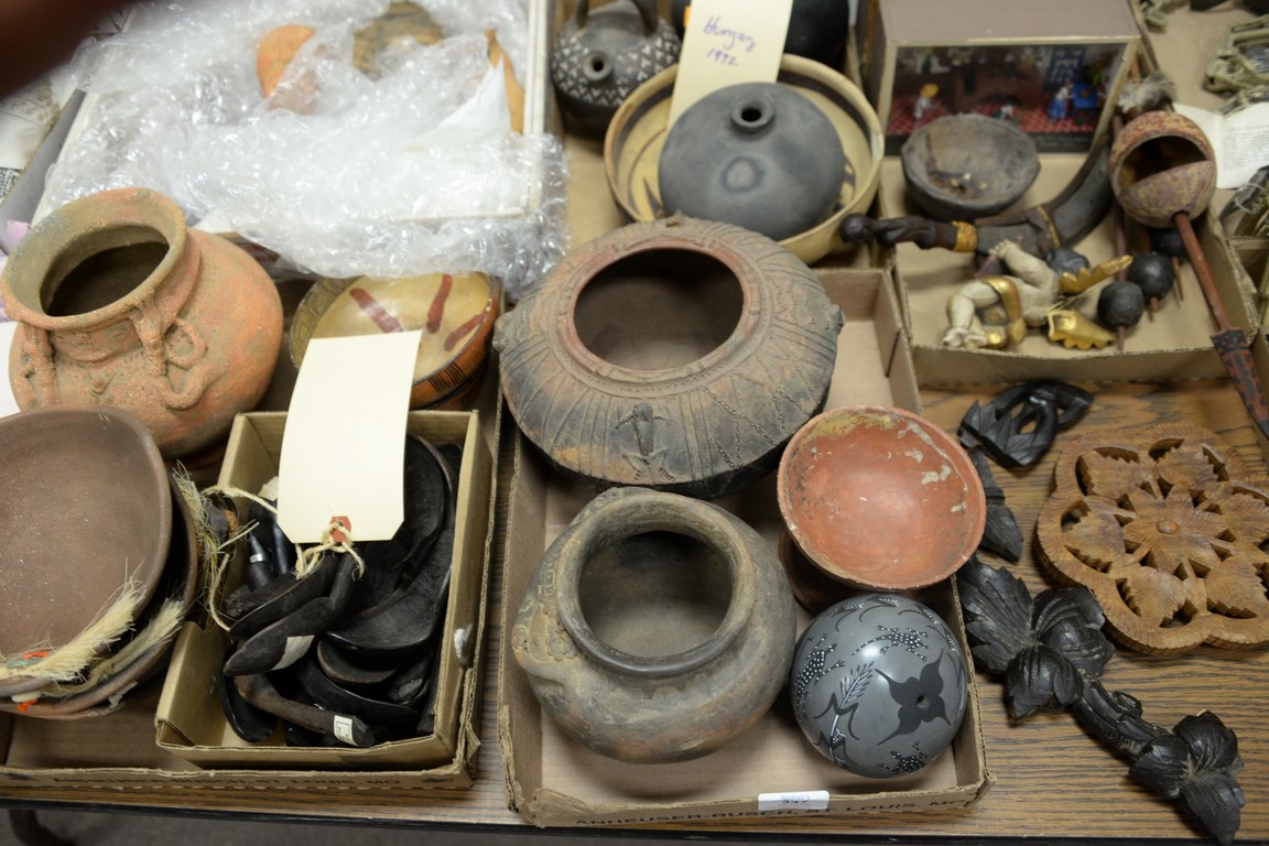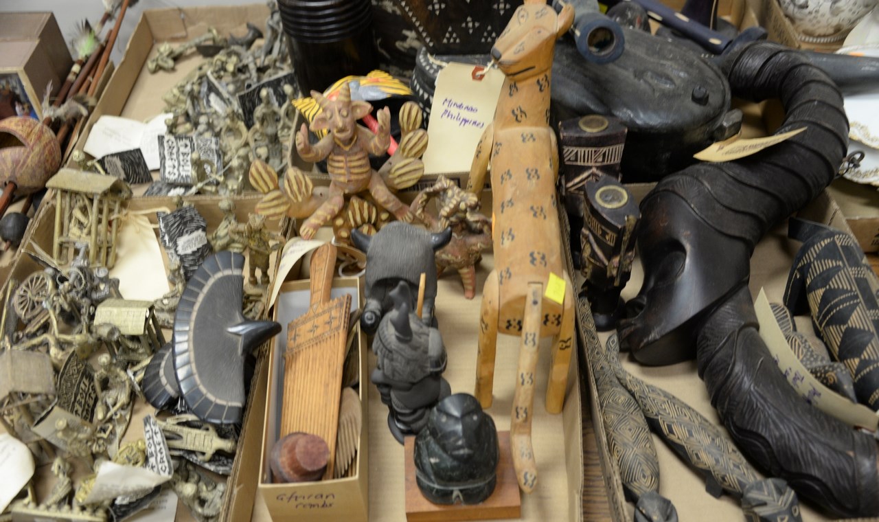 Seven box lots to include T’Boli craft figures, three Eugene Gutierrez figures, carved wood figures, lift top covered box, candlesticks, shadow boxes, etc.