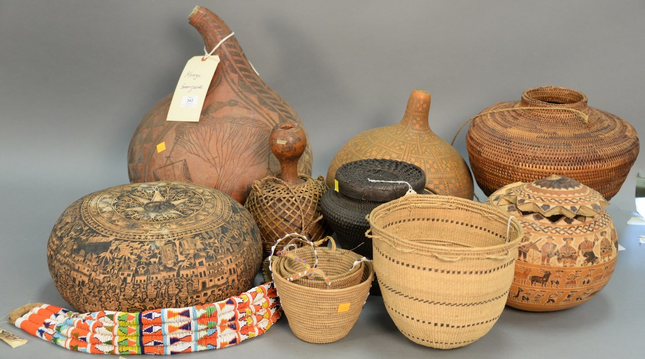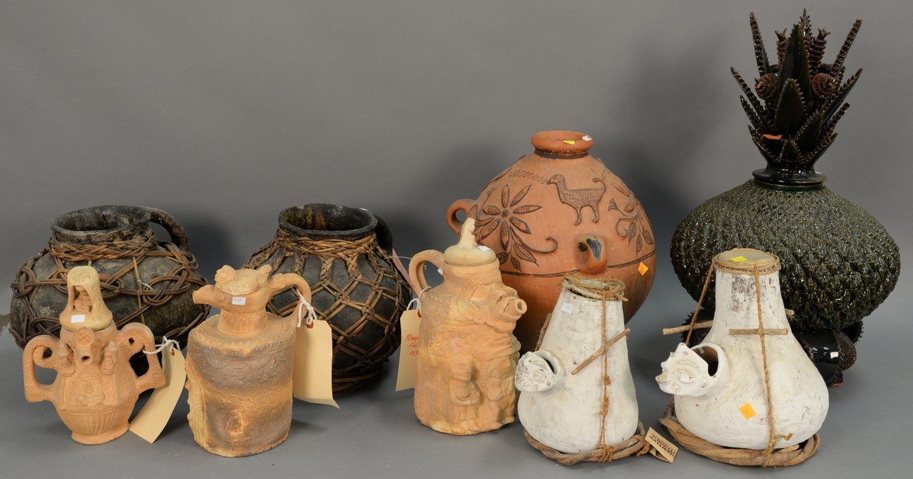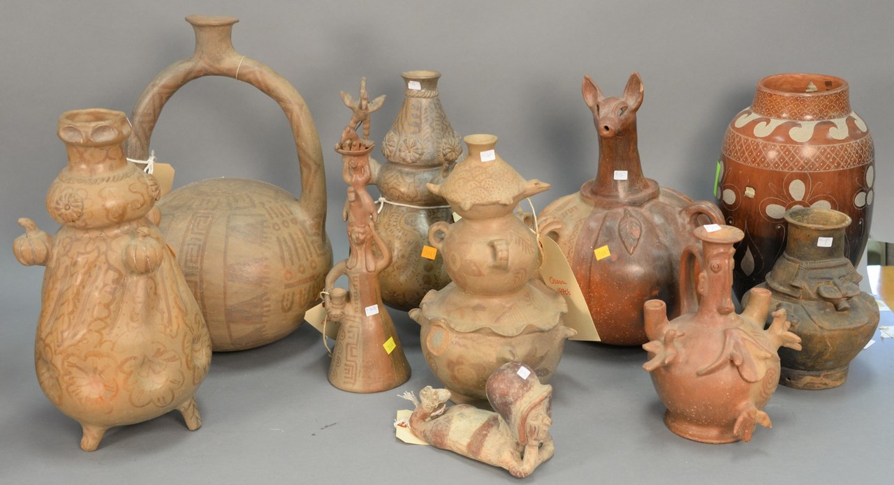 Ten South American Indian pottery vessels to include vessels with molded gourde and birds, one with gourde body and animal head spout, large vase, Ecuador figure, etc. hts. 5 in. to 19 in.