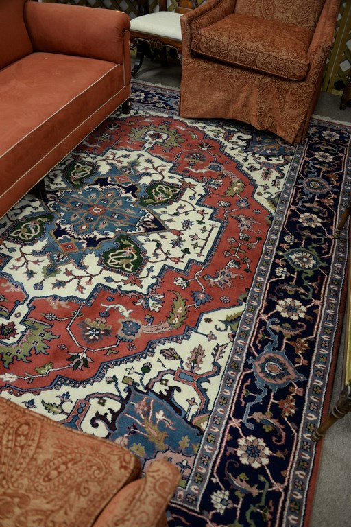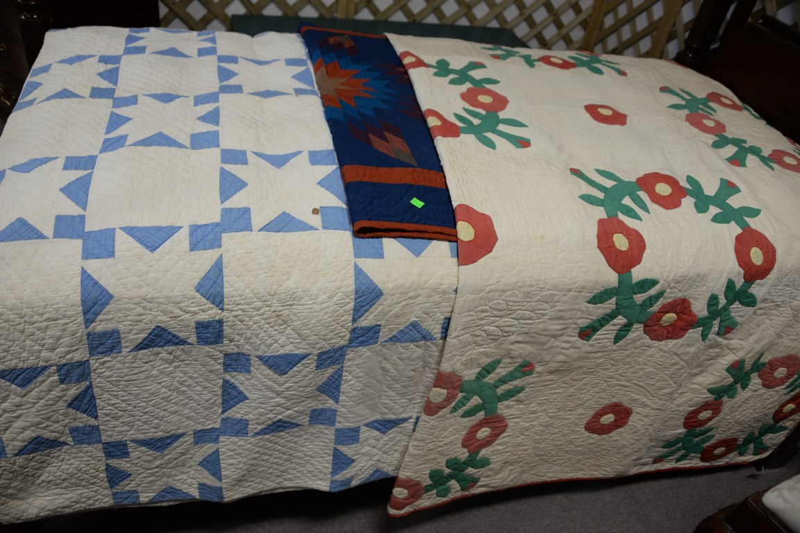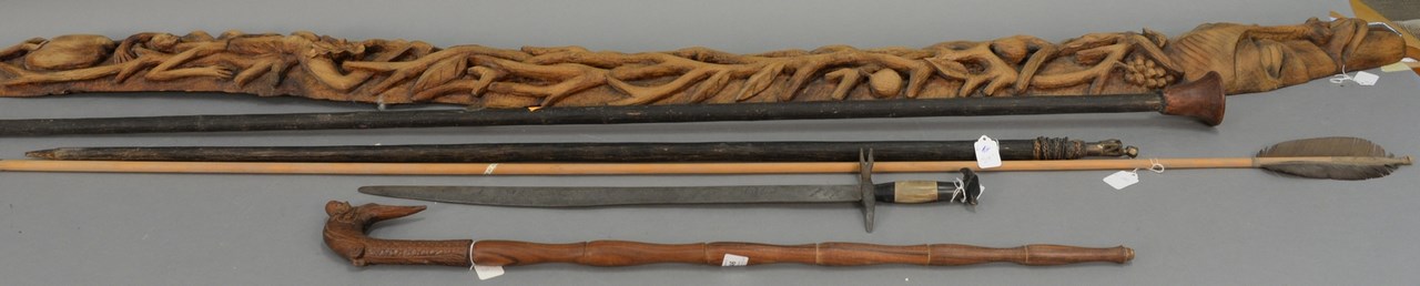 Large group of carved Mexican and South American pieces to include a three dimensional religious case, paint decorated lift top box, two carved seated figures ht. 18 & 20, three head dresses lg. 45 to 60, and two blankets.