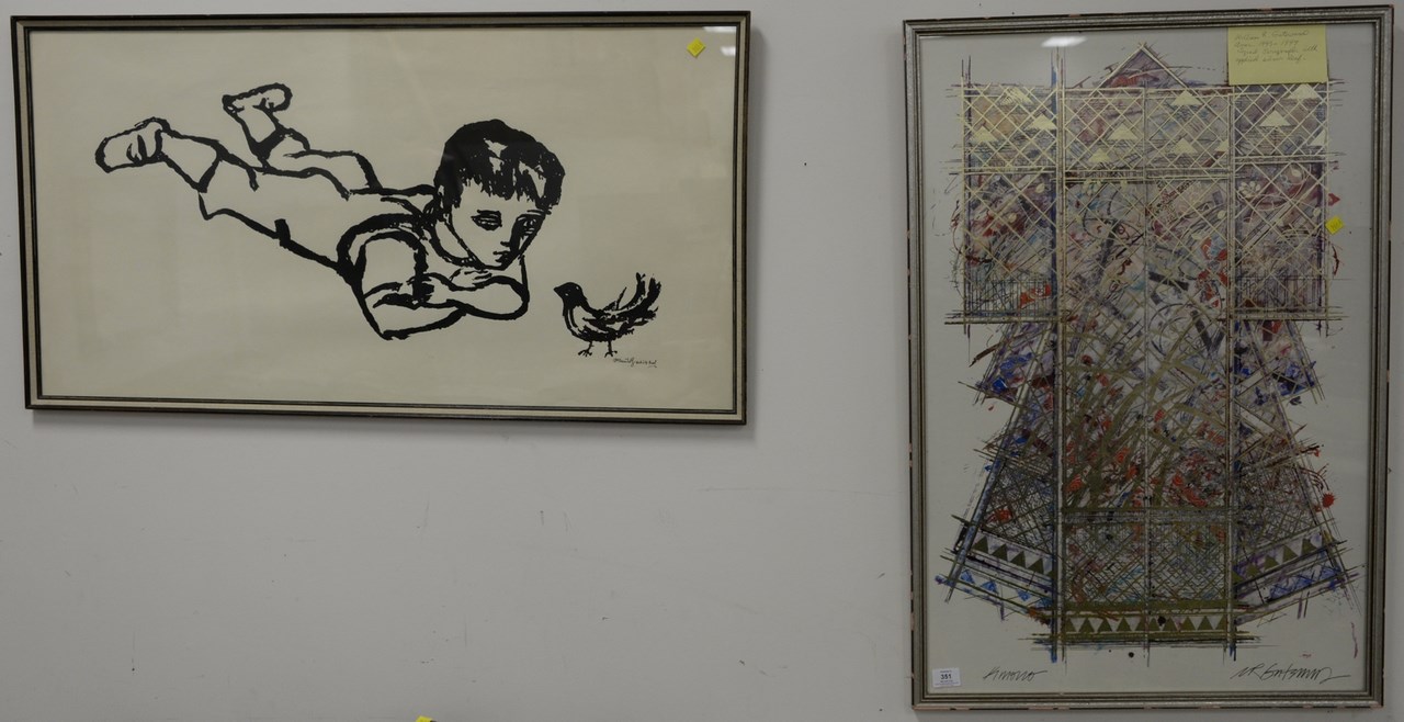 Two framed prints to include William Gatewood 1943-1994 serigraph with applied silver leaf Kimono abstract signed lower right W. Gatewood 35 1/2 x 23 1/2 and Frank Kleinholz 1901-1987 lithograph of boy with bird 21 x 40.