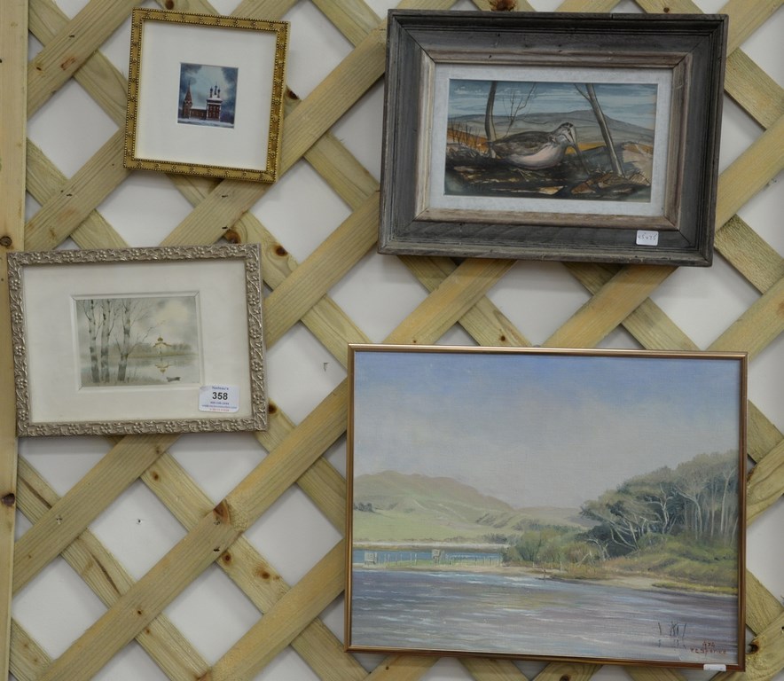Four framed paintings, T. Everad Spence 20th century of inlet edge signed lower right T. E. Spence 74 11 x 14, two small paintings of a church, and a watercolor of a sand piper.