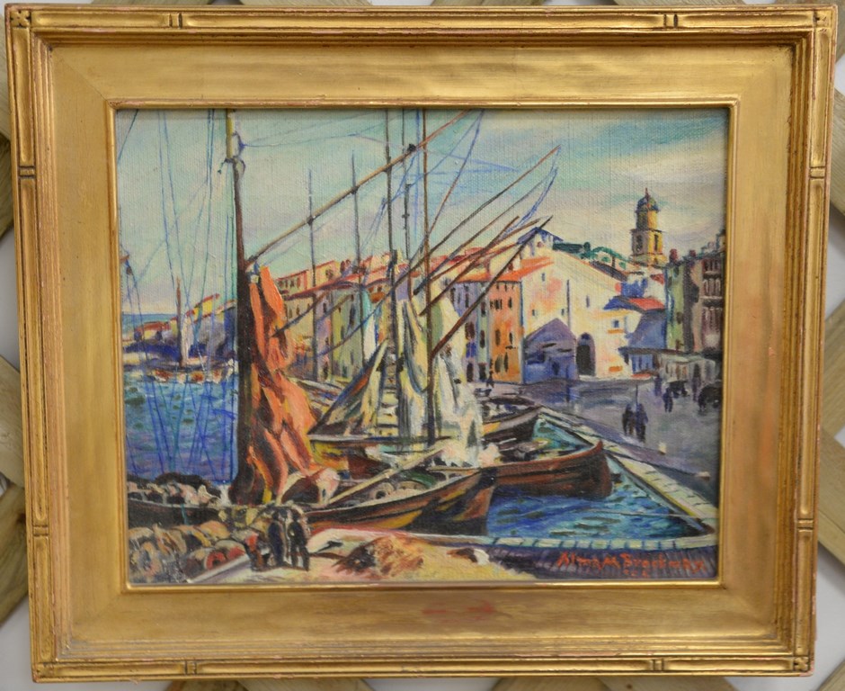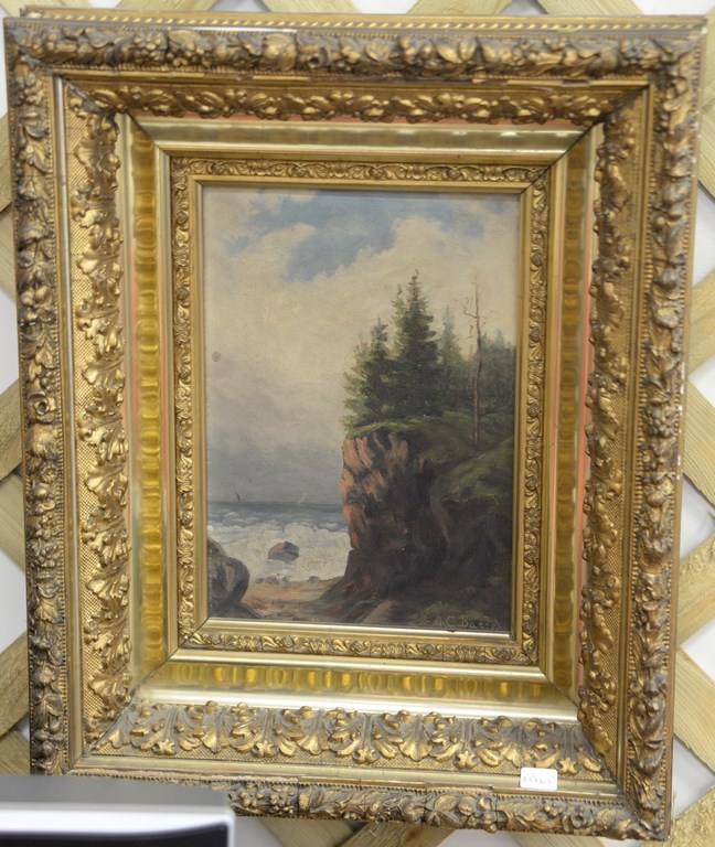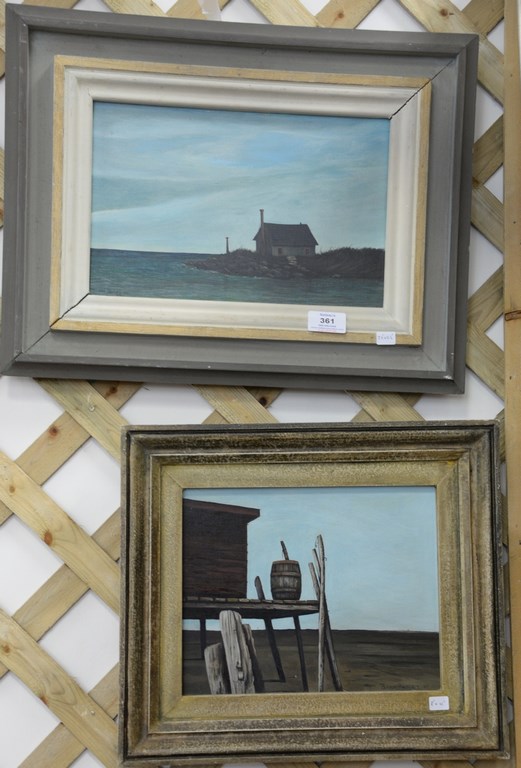 Bruce Penney 1929 two oil on board paintings, Tide Out at Docks signed lower left Bruce Penney 65 and Cabin on Water’s Edge signed lower right Bruce Penney 66. 7 1/2 x 11 1/2 and 8 x 10