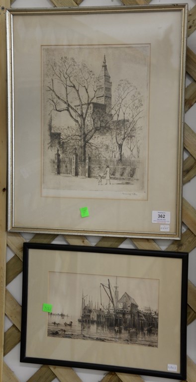 Two etchings including Charles Adam Platt 1861-1933 Spars marina marked lower right C.A. Platt 81 and Rosamond Niles 1881-1960 of church gates 12 1/2 x 9.