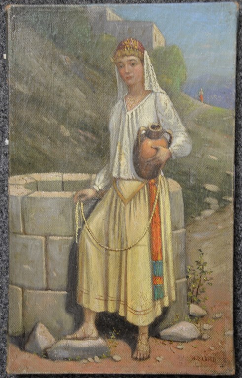 Two small oil paintings including Ernst Heinemann 1848-1912 Have Your Picture Taken signed on label on reverse with Salmagundi Club label on reverse and Fred Lawrence Messersmith sunset signed lower right Messersmith. 4 x 5 and 6 x 9.